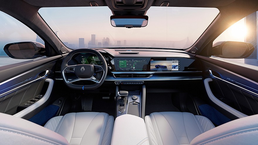 Салон у Renault Filante строго пятиместный с вместительным багажником объёмом 633 л (с сложенными спинками заднего дивана — 2071 л). В переднюю панель интегрированы три экрана — приборный, настроечно-мультимедийный и развлекательный для переднего пассажира, каждый экран имеет диагональ 12,3 дюйма, а приборный экран дополнен 25,6-дюймовым проекционным экраном на лобовом стекле. Базовая аудиосистема Arkamys насчитывает восемь динамиков, а у топовой аудиосистемы Bose Premium их десять и есть активное шумоподавление. В числе заявленных электронных ассистентов водителя есть адаптивный круиз-контроль, автопарковщик, камеры кругового обзора, цифровое зеркало заднего вида и система обнаружения забытого в салоне ребёнка.
