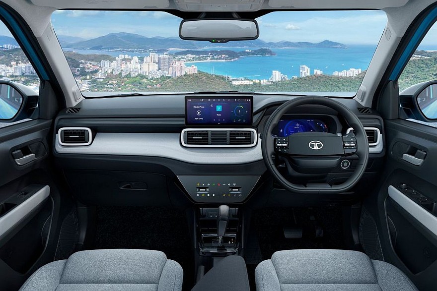 Внутри топливный Tata Punch теперь, напротив, почти полностью повторяет электрокар. Тут аналогичные новый руль, полноценная виртуальная приборка и сенсорный блок управления «климатом». Кроссоверу также достались более комфортные кресла. В богатых комплектациях еще есть беспроводная зарядка, люк в крыше и круиз-контроль. Кроме того, «роскошные» версии отныне имеют камеры кругового обзора (прежде была камера заднего вида).