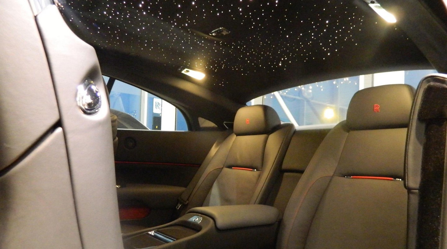 Стандартная деревянная отделка была целиком заменена на карбоновую, и она прекрасно сочетается с кожаной обивкой соответствующего черного цвета. Присутствуют также и ярко-красные акценты. Все великолепие интерьера дополняется фирменным "звездным небом" Starlight Headliner – отделкой потолка светодиодами, имитирующими ночное небо. На изготовление одной такой подсветки требуется от 9 до 17 часов, согласно словам производителя.