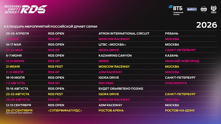 В 2026 году зрителей и участников ждут шесть этапов главного чемпионата страны по дрифту – Гран-при Российской Дрифт Серии (RDS GP). Летний спортивный сезон по традиции стартует в первые майские выходные, 2-3 мая, на автодроме Moscow Raceway (Москва). Уже в конце месяца, 23 и 24 мая, пилоты и болельщики отправятся в Санкт-Петербург на «Игора Драйв». Третий этап RDS GP пройдёт 13 и 14 июня на любимой многими атмосферной трассе NRing в Нижнем Новгороде.