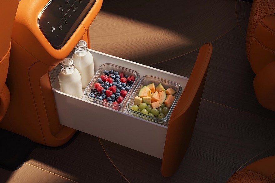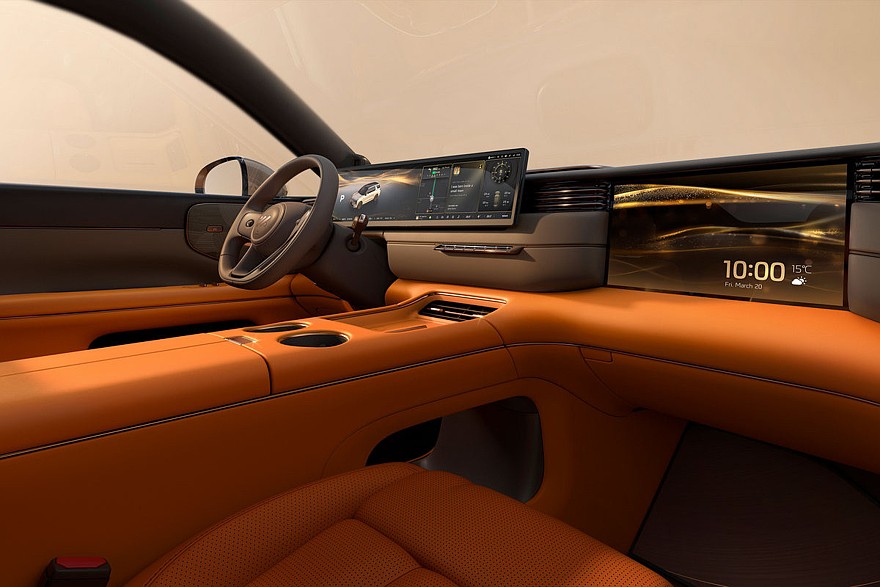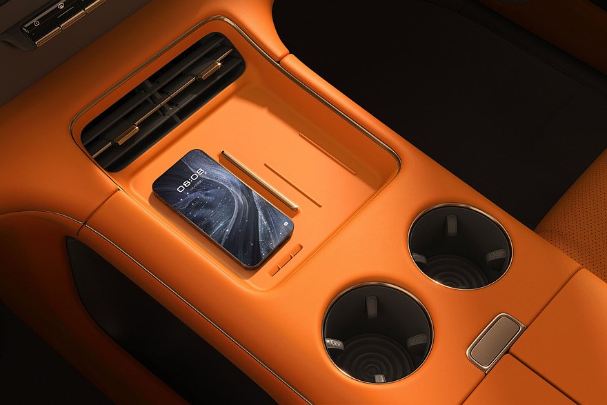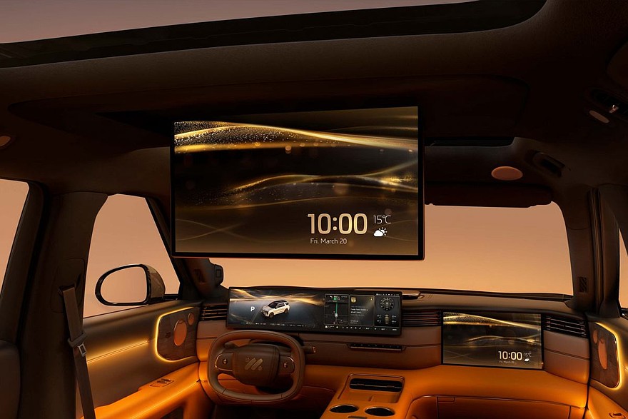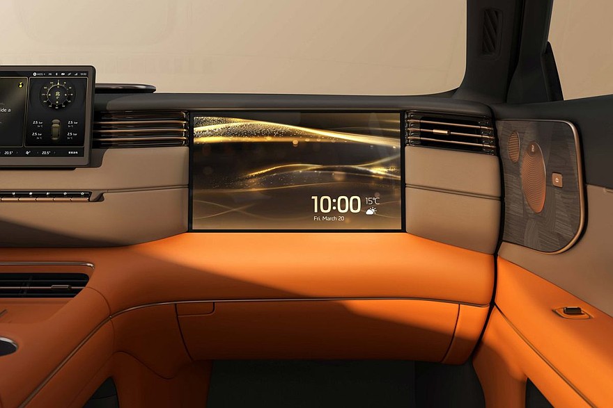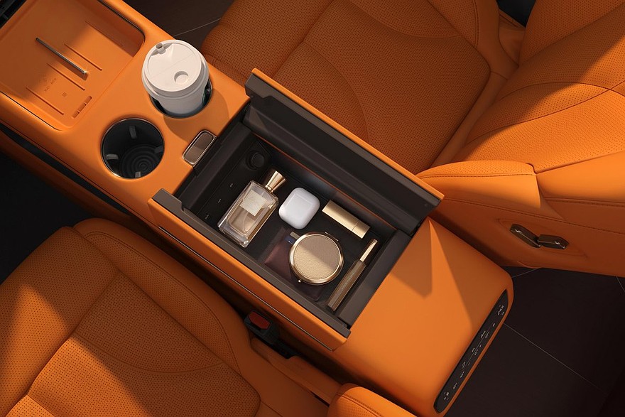 Перед водителем установлено табло диагональю 27,1 дюйма, которое совмещает функции приборки и мультимедийной системы. Со стороны пассажира – встроенный в переднюю панель тачскрин на 15,6 дюйма. Для задних седоков предусмотрен собственный «потолочный» дисплей размером 21,5 дюйма. В торце центрального тоннеля есть выдвижной бокс с функциями подогрева и охлаждения.