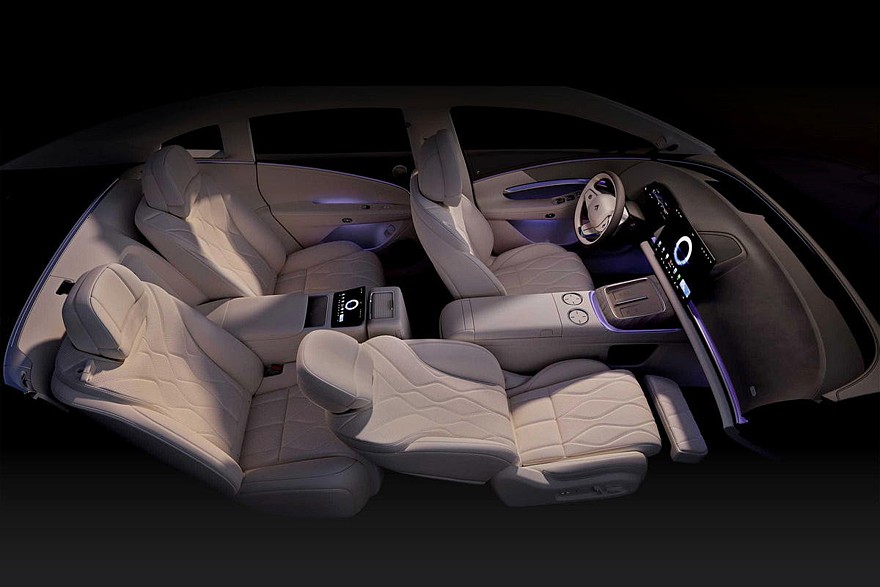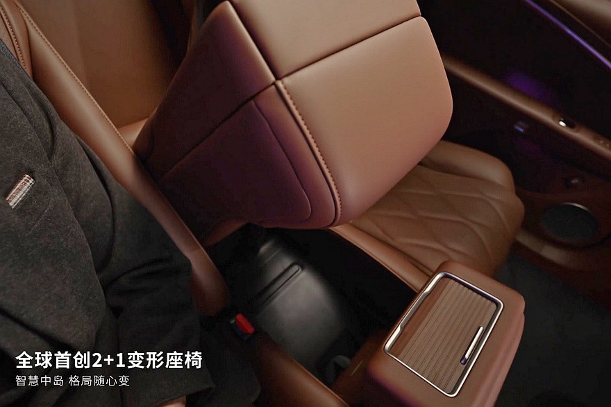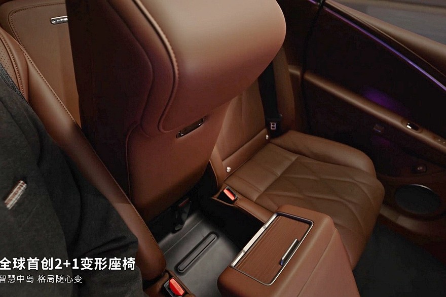 Предтоповое и самое богатое исполнения – это также пневмоподвеска, встроенный в фары проектор, натуральная кожа, дополнительная беспроводная зарядка спереди, отсек с функциями подогрева и охлаждения, система активного шумоподавления, динамики в подголовнике водительского кресла, массажер и подогрев всех сидений. А еще в этих комплектациях седан Hyptec A800 может стать четырехместным. Нужно будет лишь нажать кнопку, после чего центральная часть спинки заднего дивана опустится, а центральная же часть непосредственно сиденья – поднимется. В итоге, получится массивная «тумба» с отдельным тачскрином (7,9 дюйма), площадками для зарядки телефонов и ящичком, прикрытым шторкой. Такое решение в Hyptec назвали «2+1», для начальных версий это опция.