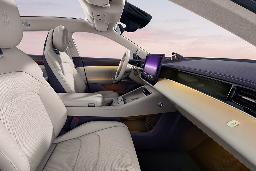 В салоне установлены приплюснутый трехспицевый руль, раздельные экраны приборки и мультимедийной системы. Центральный планшет выдвигается из передней панели, после чего его можно наклонять вправо или влево. Перед передним пассажиром есть полочка. Отметим, два последних решения применены и в только что представленном кроссовере Aito M6 (марка Aito также входит в альянс HIMA).