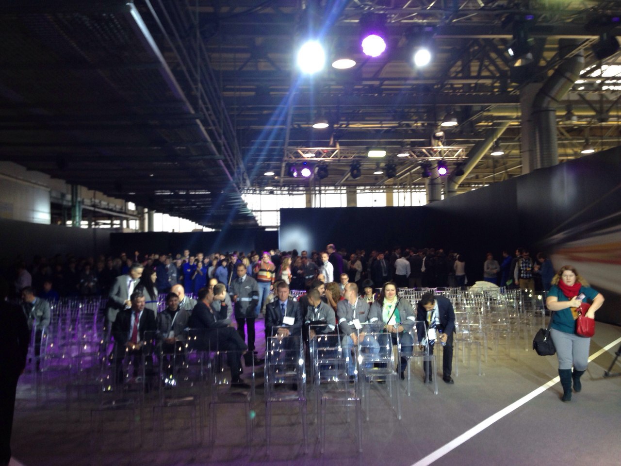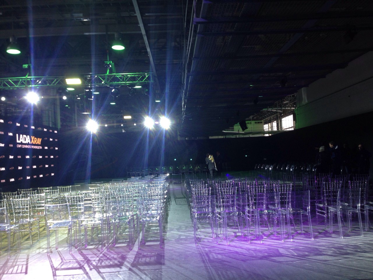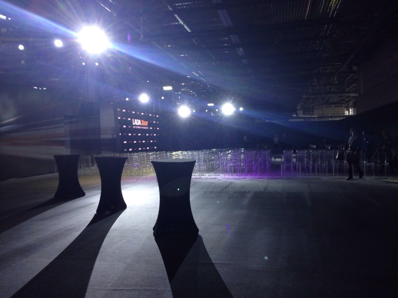 11:50 – Нас доставили до конференц-зала. До старта – менее получаса. Среди присутствующих – сотрудники АВТОВАЗа, пресса. Мы были на старте производства Весты в Ижевске в конце сентября и хотим отметить, что там народу было меньше... Сейчас здесь примерно 300 человек. Люди прибывают ещё и ещё.
