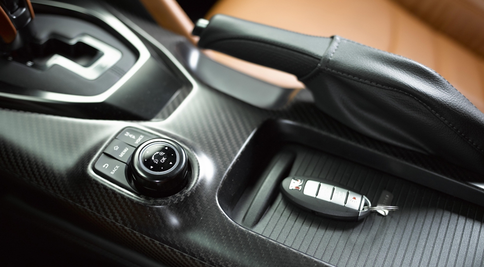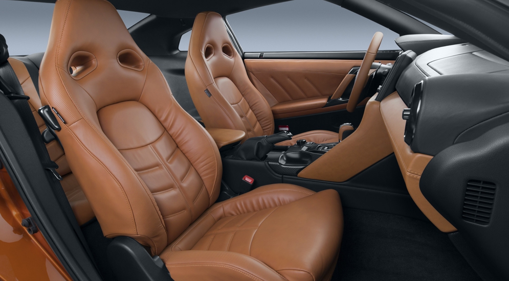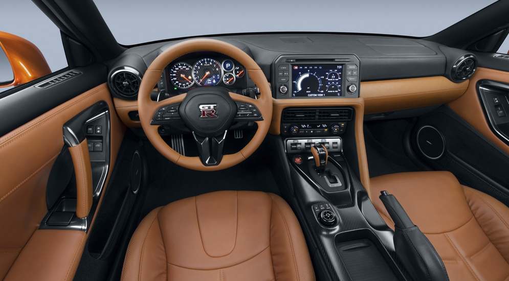 В компании отмечают, что интерьер GT-R выполнен в «премиальном стиле». Например, передняя панель и панель приборов обшиты высококачественной кожей. Подрулевые лепестковые переключатели перемещены на рулевое колесо. Количество кнопок на центральной консоли уменьшилось с 27 до 11, появился 8-дюймовый сенсорный дисплей. Для интерьера топовой версии Premium Edition предлагаются четыре цветовых решения: Black/Rakuda, Samurai Black, Black/Amber Red и Black/Ivory.