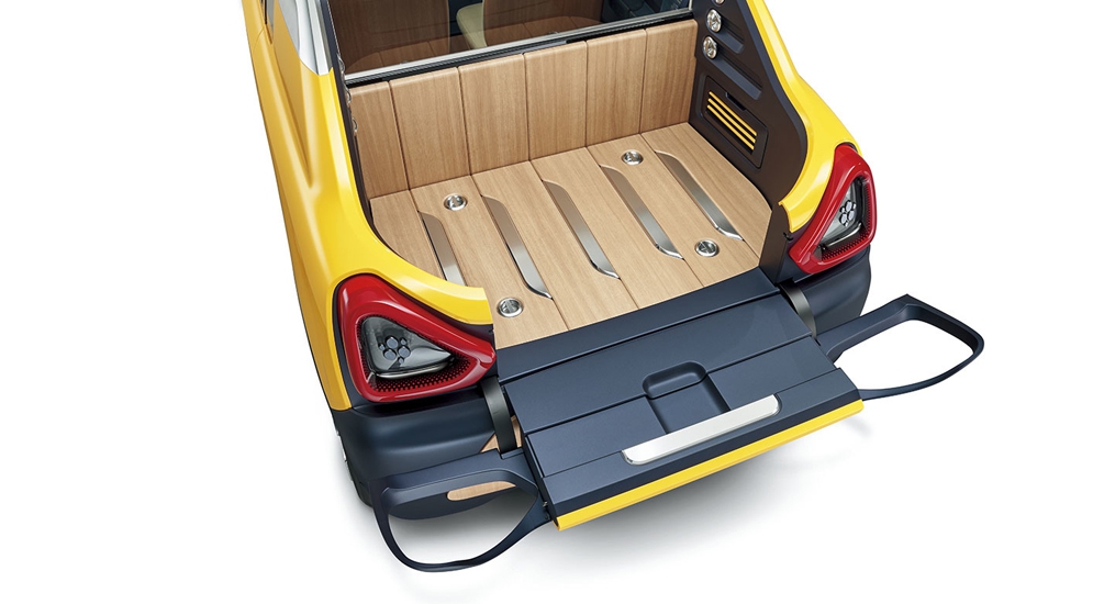 Стойки окрашены в чёрный и на фоне яркого преимущественно жёлтого кузова практически незаметны. За кабиной начинается короткая "палуба", под полом которой прячется багажный отсек. Морские параллели удачно подчеркивает деревянный настил, а также панели "под дерево" на переднем и заднем бамперах. Погрузку облегчает откидной борт-аппарель.
