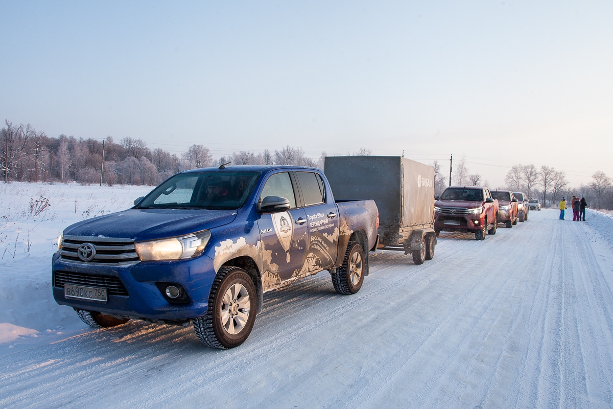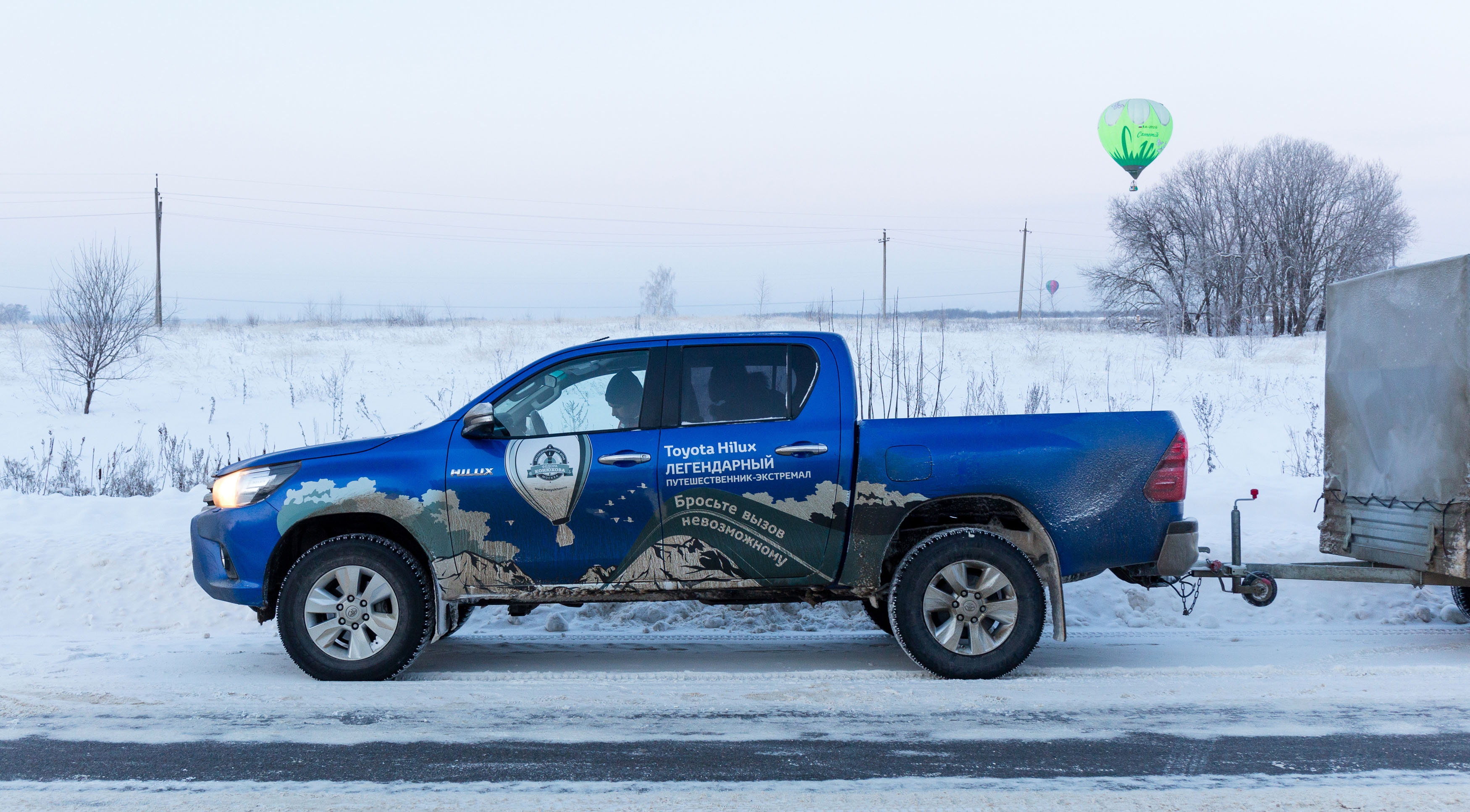Беспосадочный полёт диктовал условия маршрута для Toyota Hilux: постоянно меняющаяся траектория полёта вынуждала экипаж пикапа, который возглавлял сын Фёдора Конюхова – Оскар, то и дело менять направление, чтобы не потерять воздушный шар из виду. В пресс-центре компании Тойота отметили, что путь пролегал в том числе по труднопроходимым просёлочным дорогам и заснеженному бездорожью в тёмное и светлое время суток при экстремальных минусовых температурах.