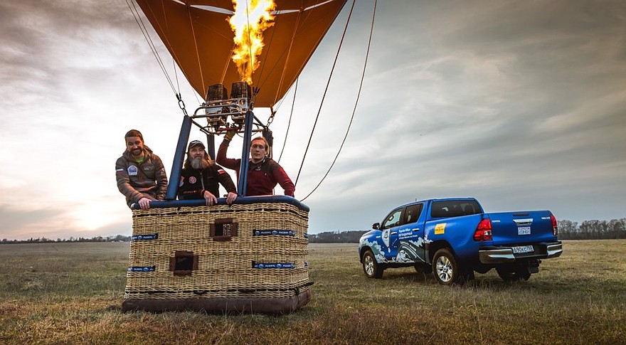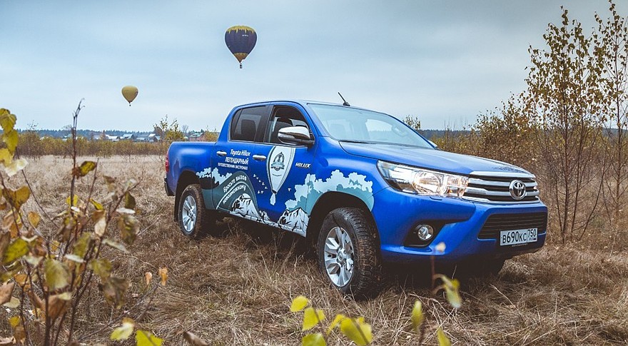 Как верный помощник, пикап транспортировал шар и корзину к месту старта и от финиша, вместе с наземной группой поддержки следовал за аэростатом как по дорогам, так и по бездорожью, а также помогал при сборе использованных газовых баллонов. Отметим, своей выносливостью и проходимостью Hilux обязан раме лестничного типа, надёжной подвеске и успевшей зарекомендовать себя системе полного привода с блокировкой заднего дифференциала. Важную роль играют вместительность и грузоподъёмность автомобиля.