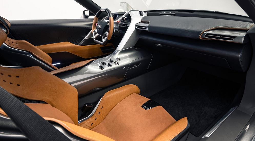 На деле "Тойота" лишь разнообразила палитру красок нового FT-1 Vision Gran Turismo, добавив черный "глянец". Также в компании решили подарить салону больше благородных оттенков, выбрав для отделки кресел, тоннеля пола и рулевого колеса светло-коричневую кожу.