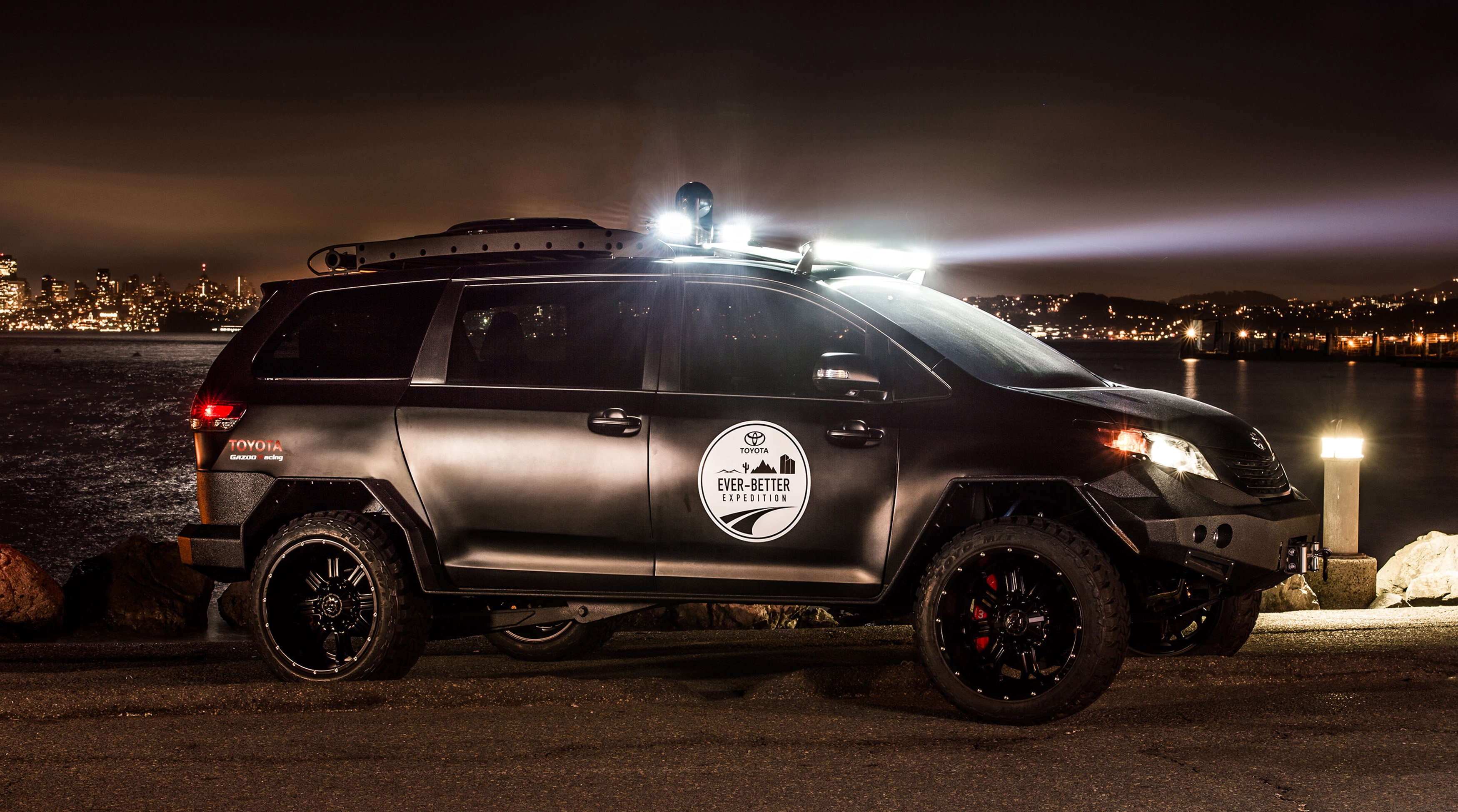 Конечно, минивэн вмещает всё это без особых проблем, но перевозить этот багаж по бездорожью он не смог бы. Поэтому кузов Sienna установлен на шасси от Tacoma. И это шасси хорошо доработано: четырёхрычажная подвеска Engaged с длинным ходом (до 40 см), шины 33×22 Nitto Mud Grappler на 22-дюймовых дисках Monster Energy 539B.