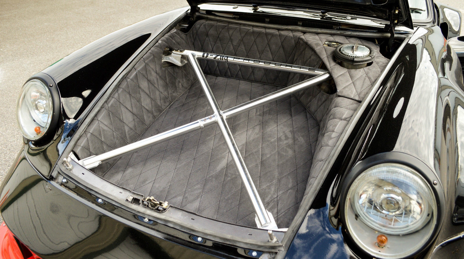 И хотя автомобиль не является точной копией модели 934, некоторыми «ништяками» из автоспорта он всё же обладает. К числу таких относятся колёсные диски Forgline размера 10,5х18 спереди и 14х19 на задней оси. Где ещё вы встретите такую ширину «катков» и крепление к ступице посредством центральной гайки? Подвеска занижена при помощи регулируемых компонентов от Bitslein, а под передним капотом расположилась иксобразная распорка. На серьёзность автомобиля ориентируют карбоновые «ковши».