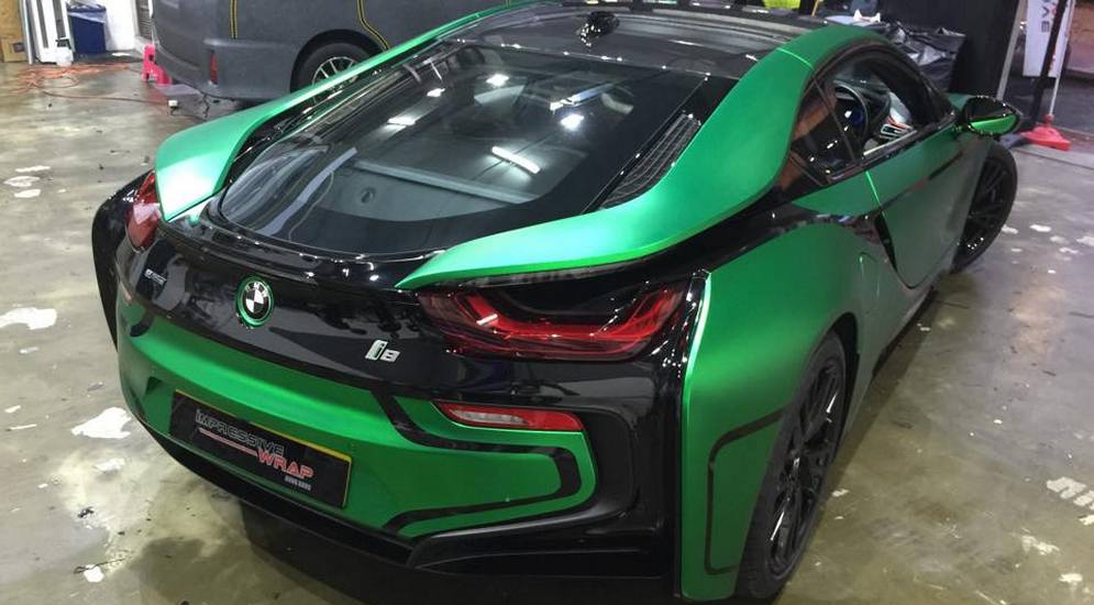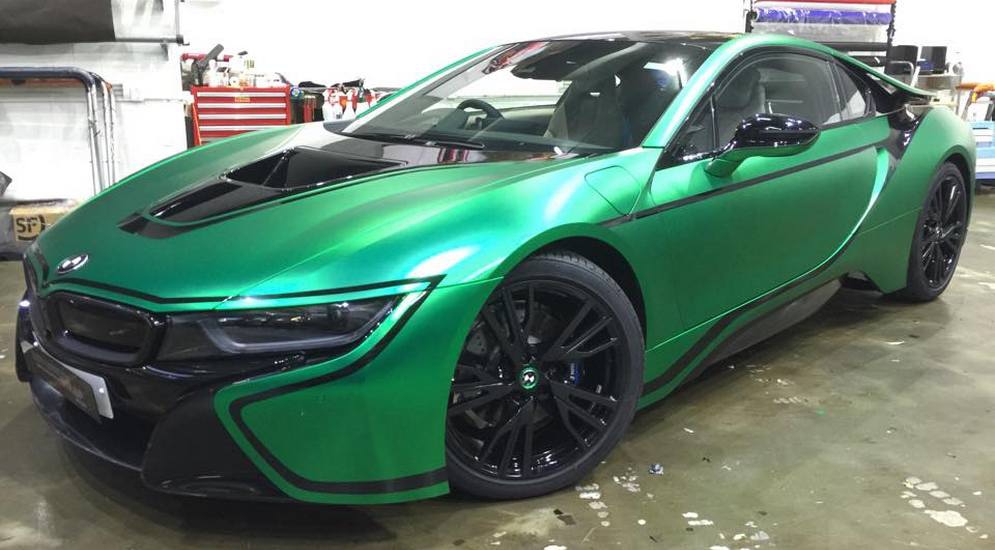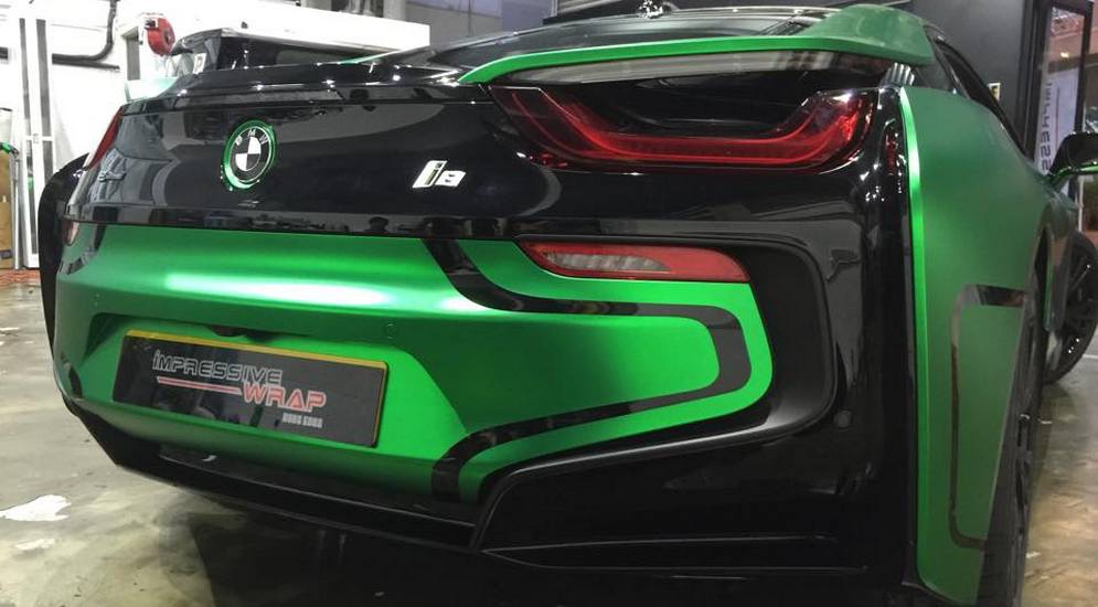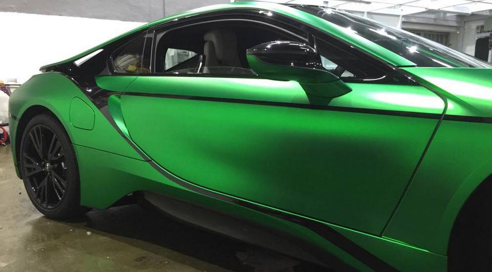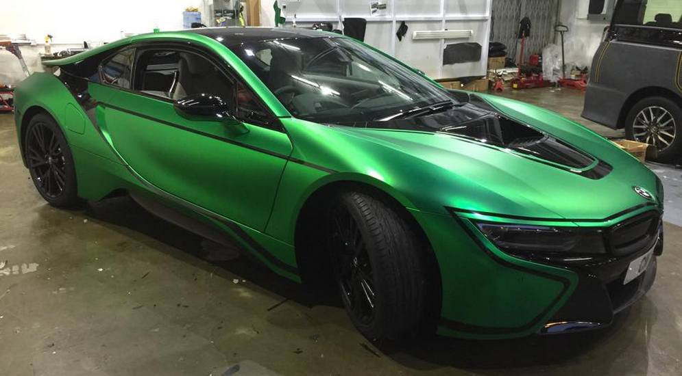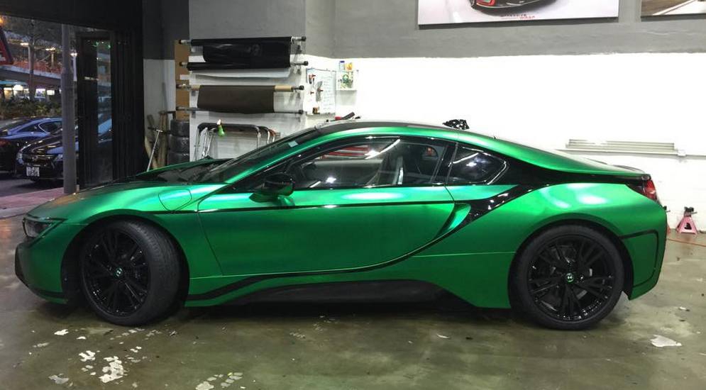 Ателье занимается нанесением на автомобили виниловой плёнки, и в их активе сотни по-настоящему эксклюзивных проектов. У китайцев особая любовь к баварскому бренду — на сей раз в плёнку обернули новинку BMW i8. И без того редкая «электричка» стала похожей на рептилию благодаря плёнке цвета «матовый зелёный хром».
