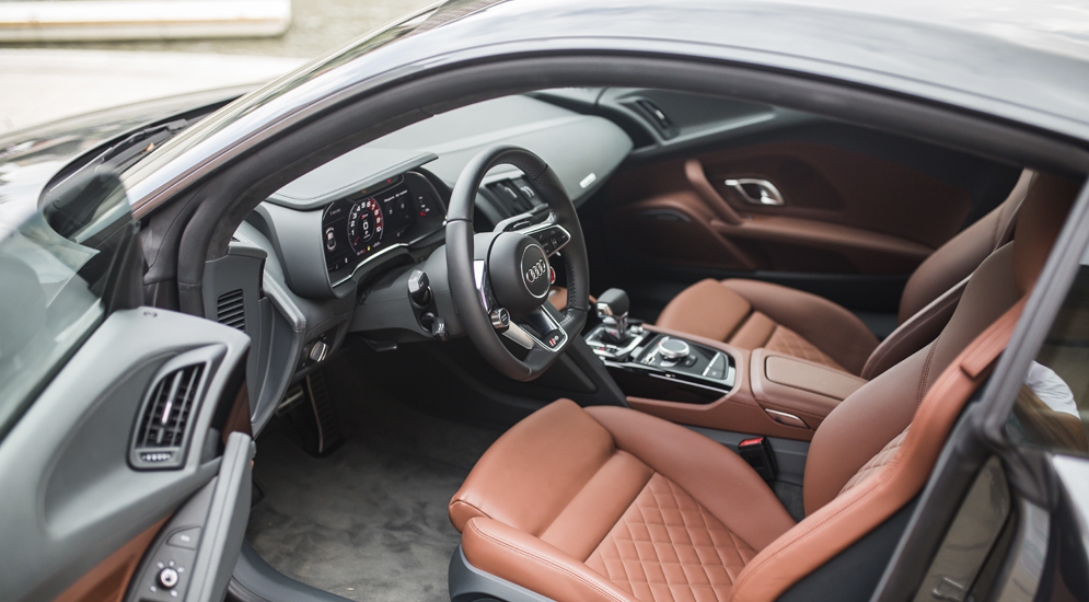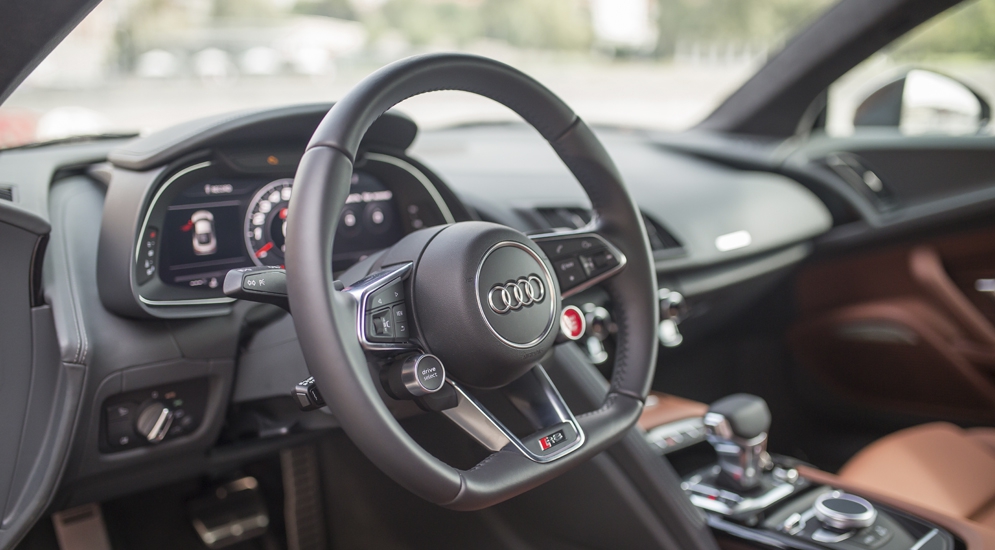 В стандартное оснащение Audi R8 V10 plus входят светодиодные фары, которые за доплату могут быть заменены опциональной лазерной оптикой. Исчерпывающую информацию водителю дает виртуальная приборная панель.