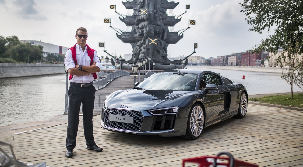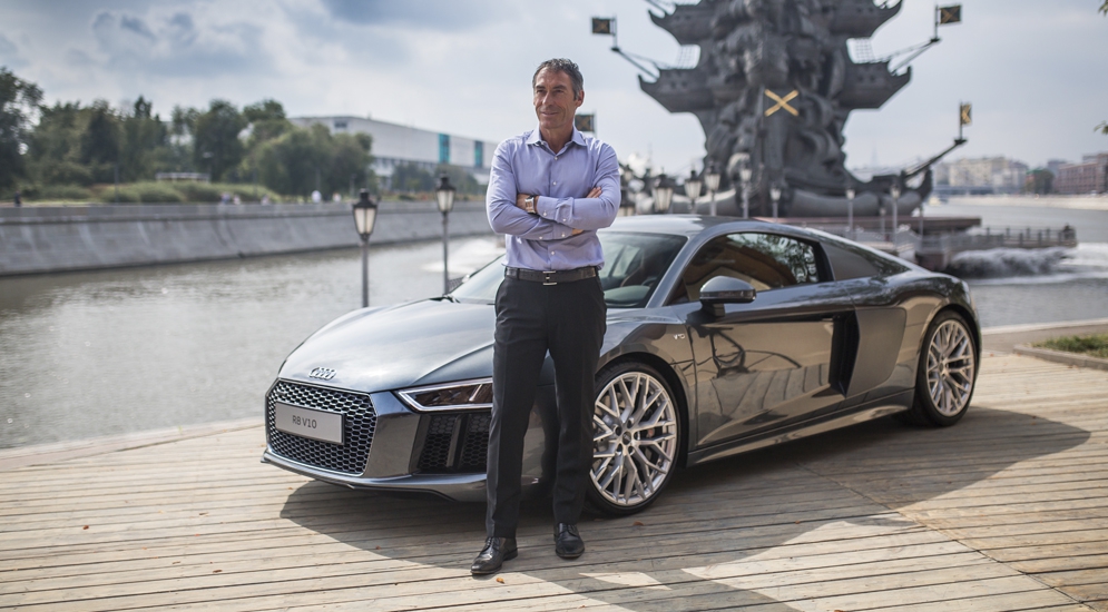 На фото: Audi R8 в России презентовали Ахим Заурер и пилот команды Audi Sport Нико Мюллер