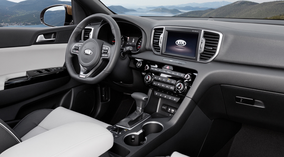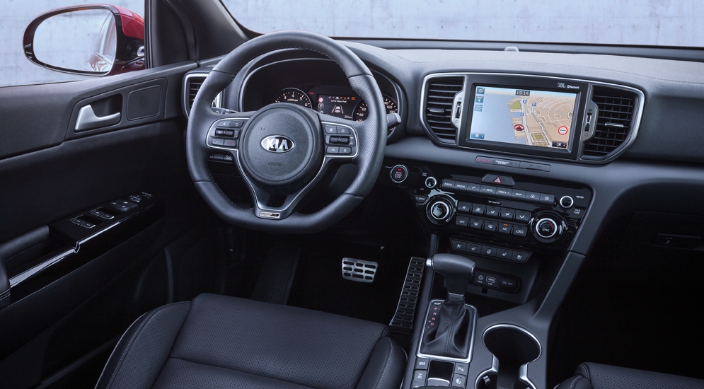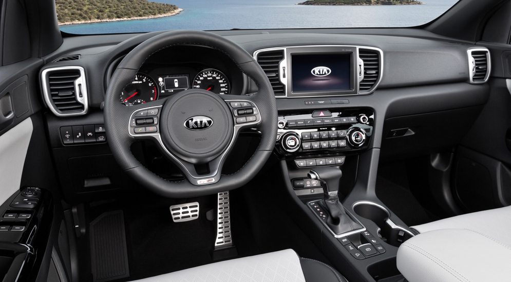 Спортивная модификация Kia Sportage GT-Line отличается от остальных дизайном экстерьера, а в салоне такого автомобиля установлены усеченный спортивный руль с подрулевыми лепестками переключения передач, декоративные алюминиевые накладки на педалях и порогах.