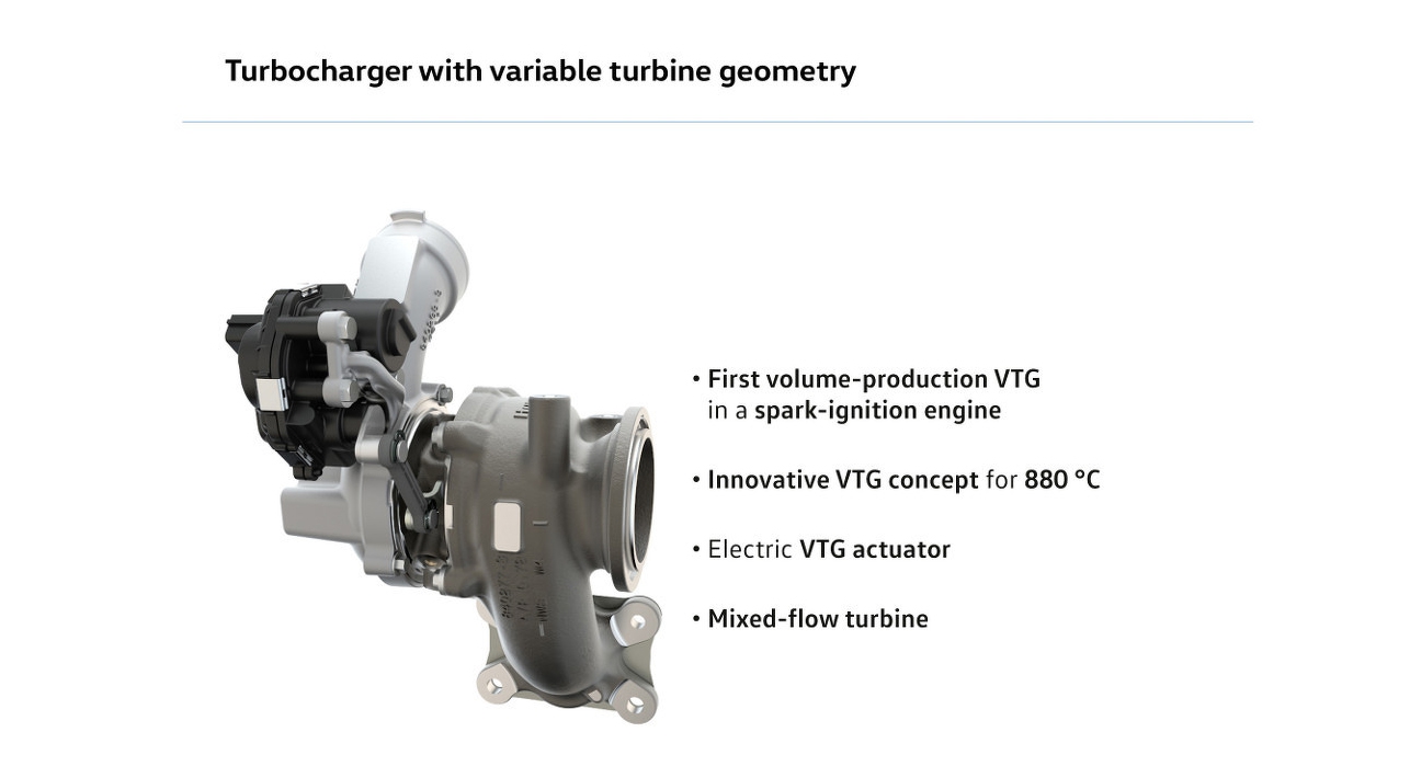 Основные конструктивные особенности нового EA 211 TSI evo — работа по циклу Миллера и турбокомпрессор с изменяемой геометрией крыльчатки. Цикл Миллера предполагает закрытие впускного клапана раньше окончания такта впуска (возможны другие схемы — открытие клапана позже такта впуска, закрытие позже окончания этого такта). При своих преимуществах, заключающихся в сравнительно большей мощности и увеличенном пиковом крутящем моменте при равном объёме, он имеет и недостатки — падение пиковой мощности. Последний "нейтрализуется", как раз за счёт турбокомпрессора с изменяемой геометрией турбины, который применяется на моторах с искровым зажиганием впервые.