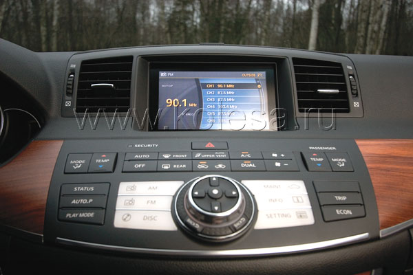 Общая компоновка водительского места в М35, может, чем-то и напоминает ту же Primera. Но здесь мы видим исполнение, которое Nissan так и не смог себе позволить. Центральная консоль вместе с пультом управления климатом, аудиосистемой и бортовым компьютером тоже находятся на своеобразном парапете. Только в Infiniti он выглядит куда более гармонично и дорого – особенно окруженный полосками палисандрового дерева теплых, карамельно-медовых, тонов. Приглядитесь: здесь есть еще и тонкие линии хрома: полированный металл придает шарм и создает ощущение роскоши, особенно, когда незаметен с первого взгляда…
