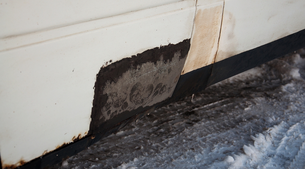 Сразу бросается в глаза неоднородная покраска автомобиля. Скажу больше – сам кузов тут не вполне однородный. Ещё три года назад Форд блестел белизной, как только что снесённое яичко, но петербургский климат сделал своё чёрное дело. Да и время беспощадно – ему что Форд, что Газель – лишь бы что-нибудь испортить. Поэтому кузов нашего Транзита постоянно требовал вмешательств человека со сварочным аппаратом, грунтовкой и краской.