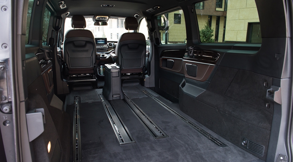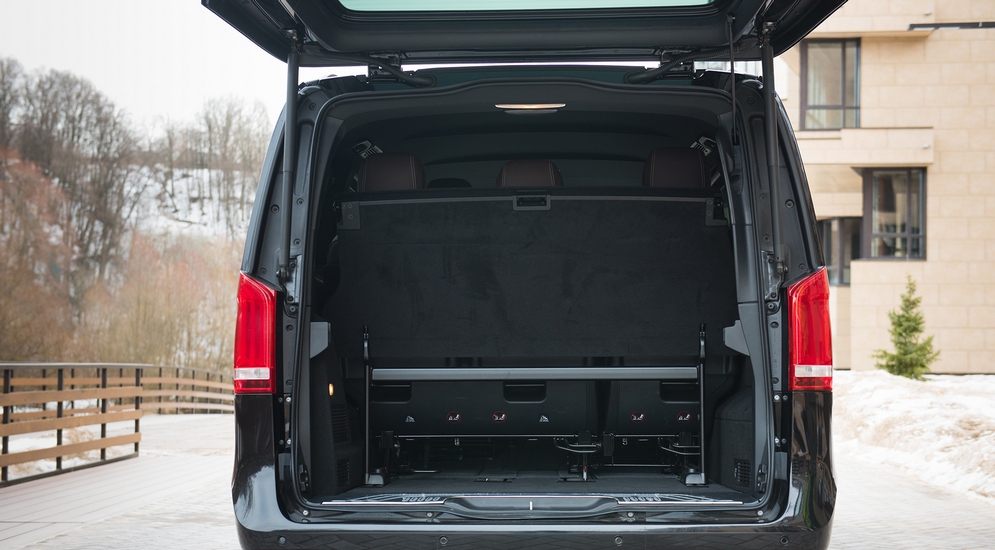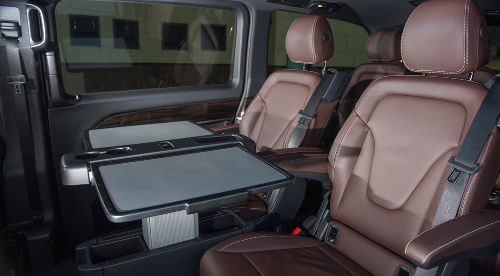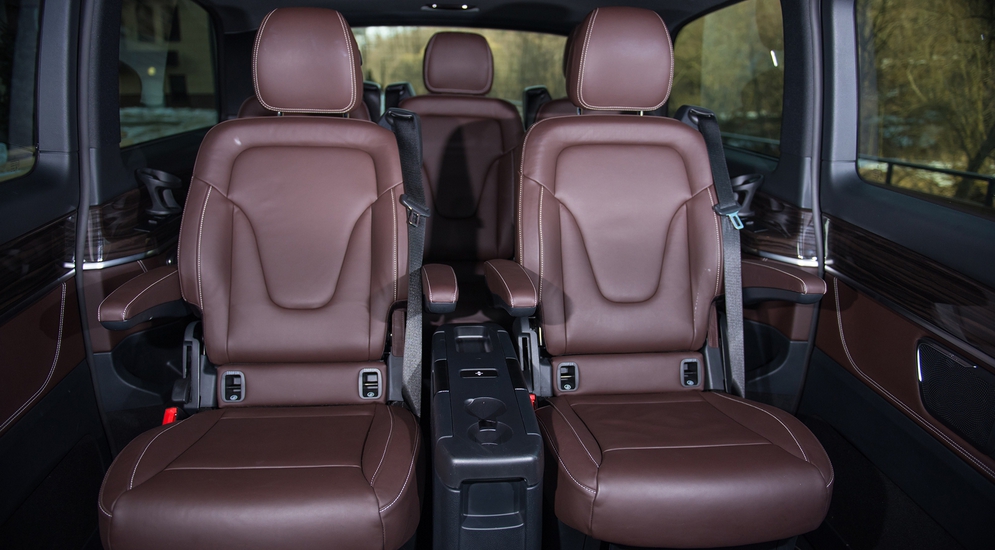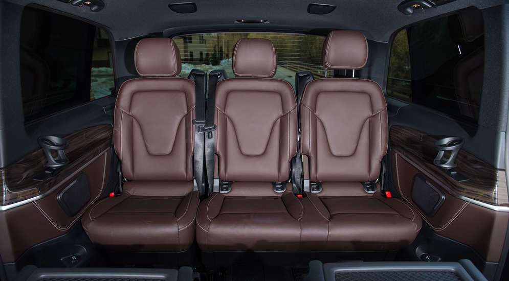 Здесь же – никаких проглядывающих частей кузова, никаких эрзац-облицовок самого дешевого пластика в «незаметных» местах, которые так и лезут в глаза. Складывается ощущение, что вначале был именно этот V-класс, из которого впоследствии методом отсечения лишнего сделали фургон Vito, а не наоборот, из «белого и пустого холодильника» методом «фаршировки» произвели дорогой V250. Это Mercedes-Benz, друзья. Они себе не могут позволить иного, кроме лучшего. В случае с V-классом – это совершенная истина. Но вернемся к содержанию. Конечно, салон обшит натуральной кожей, на торпедо и «подоконниках» в салоне – натуральное дерево, а пол покрыт ковром. Также топовой комплектации положены 17-дюймовые колесные диски с довольно низкопрофильной по «автобусным» меркам резиной 255/55 R17 и фары головного света на светодиодах, которые «умеют» следить за дорогой и регулировать световой поток, а задняя дверь оборудована подъемным стеклом. Чтобы закинуть мелочевку в багажник, необязательно открывать огромный люк целиком!
