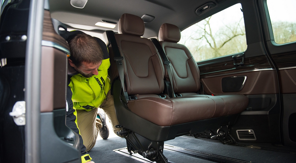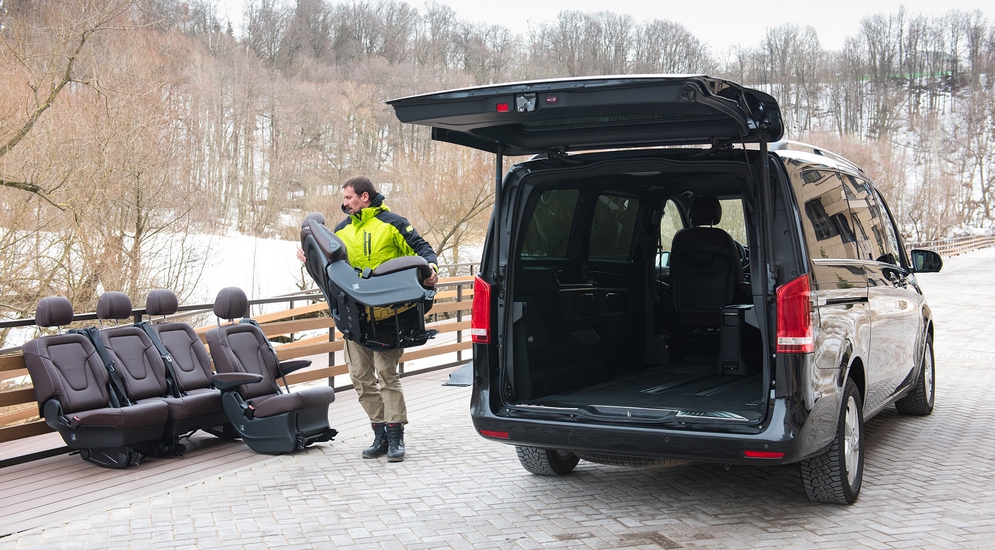 Естественно, все кресла можно вынуть или установить в свободной последовательности. Но я настоятельно отговариваю будущих владельцев или пользователей этой машины от попыток менять конфигурацию салона без посторонней помощи. У меня вообще сложилось впечатление, что эргономисты Mercedes сделали все, чтобы будущие владельцы ездили переставлять кресла к официальному дилеру! Каждое движение сиденья требует невероятных физических усилий. Чтобы просто подвинуть кресло второго ряда назад, приходится изо всех сил упираться обеими ногами и исполнять «приседание со штангой». Если в Multivan кресла разворачиваются вокруг продольной оси простым поворотом рычажка, то здесь чтобы развернуть кресло, приходится его снимать целиком и переворачивать руками. Весит каждое килограммов сорок... Не повторяйте моих ошибок, не делайте это в одиночку! Более того, прежде чем его снять, придется решить квест «куда подвинуть кресло и как его сложить, чтобы оно ничем не упиралось в процессе демонтажа». Обратная установка – тоже невероятно сложная и трудоемкая операция.