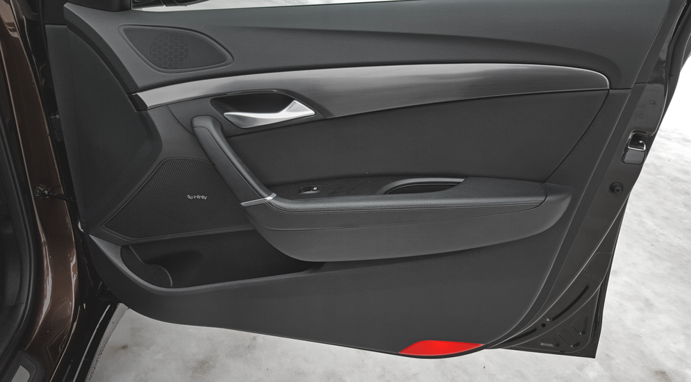 Материалы отделки салона — то, что во многом определяет ощущение от машины. В салоне i40 подавляющее большинство материалов — искусственного происхождения, и выразительно дорогие (или хотя бы пытающиеся таковыми выглядеть) среди них отсутствуют. Те же, что использованы, применены и скомбинированы небесспорно – возникает ощущение, что «салон недостаточно дорогой». Очень много черного и явно не хватает подчеркивания металлом в отделке – хотя это и «опасный» материал, с которым легко перейти грань дурновкусия.