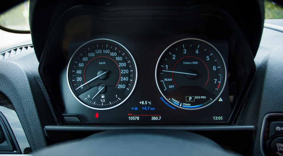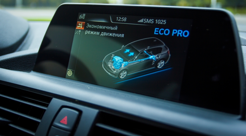 Вариантов работы двигателя и коробки несколько: Eco-Pro, Comfort, Sport, Sport+. Все как во взрослом БМВ, правда, экономный режим вызвал двойственные ощущения: с помощью особой инженерной магии энергия торможения рекуперируется в космос и экономит топливо. Машина «тупее» отзывается на педаль газа, а итоги работы космических сил видно на приборной панели в виде количества сэкономленных километров пробега. Ну окей.
