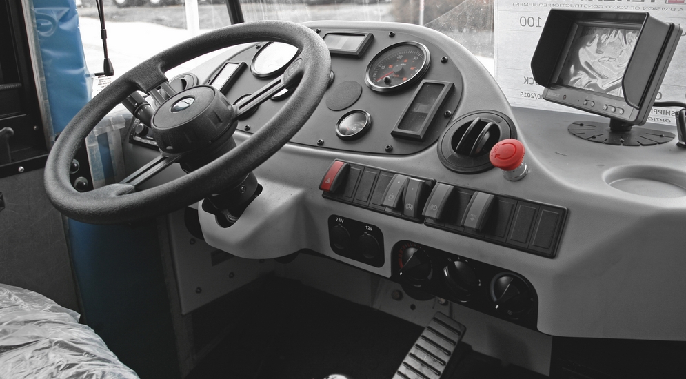 Кабина полностью отвечает требованиям технологичности и представляет собой стальную коробку со стеклами, двумя креслами для водителя и инструктора и органами управления. У кабины два входа — основной справа и аварийный слева. Пластиковые детали интерьера выполнены качественно и не пугают ни формами, ни заусенцами. На дисплейчик, установленный на передней панели, выводится изображение с камеры заднего вида. Для автомобиля такого размера камера — обязательный аксессуар.