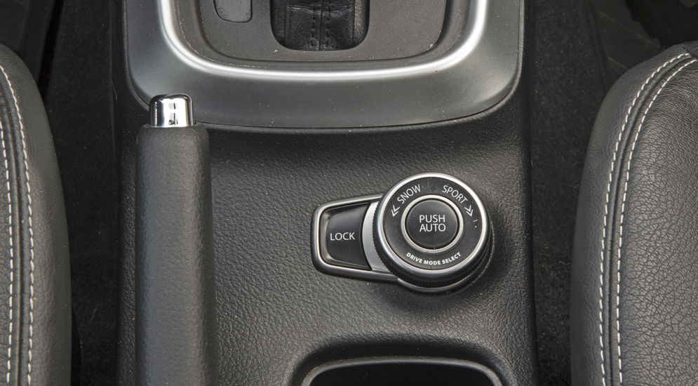 Управляется эта система шайбой, расположенной на трансмиссионном тоннеле. По умолчанию система включает режим Auto. Крутишь шайбу влево – включается Snow&Mud, вправо – Sport. Слева есть клавиша Lock, а вернуться в режим Auto можно одним нажатием на большую кнопку на самой шайбе.