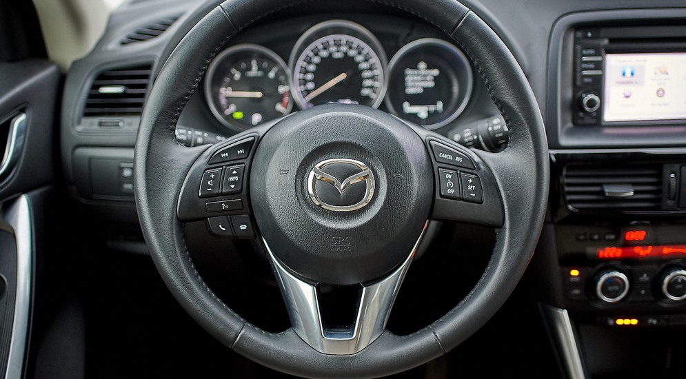 Но если к мотору и коробке передач претензий нет и быть не может, характер управляемости у CX-5 — с норовом. Подвеска настроена жестко: японцы сознательно пожертвовали комфортом ради управляемости. На наших разбитых дорогах это значит, что все нюансы качества покрытия водитель, а равно и все пассажиры, отчетливо чувствуют своими позвоночниками. В поворотах надо держать ухо востро: относительно короткая база и жесткие амортизаторы приводят к тому, что на кочках «корму» нередко переставляет. Руль, еще минуту назад радовавший информативностью, нервно вздрагивает от любой кочки.