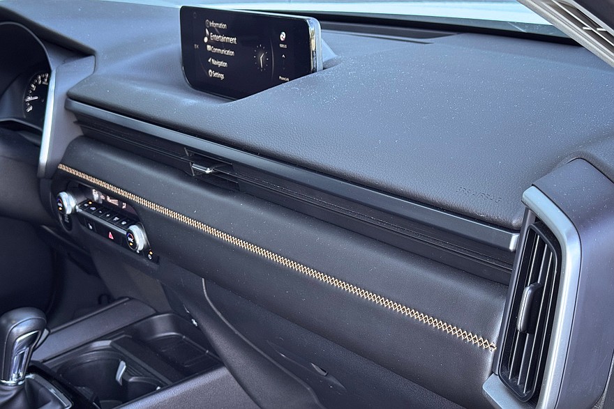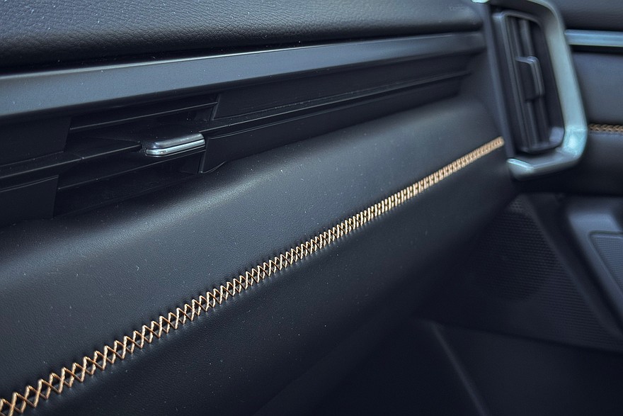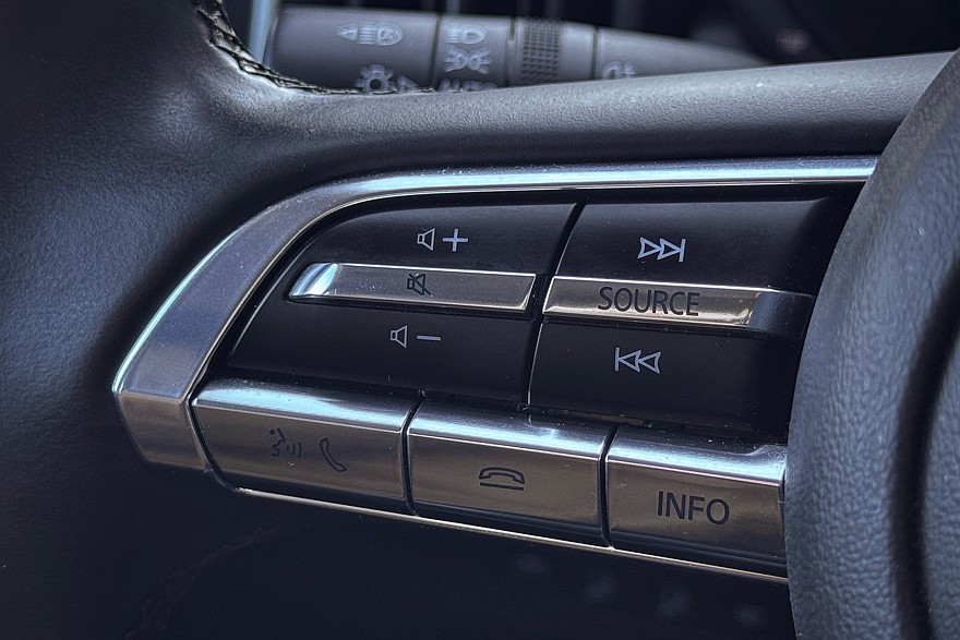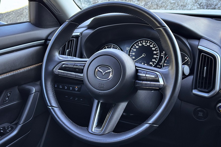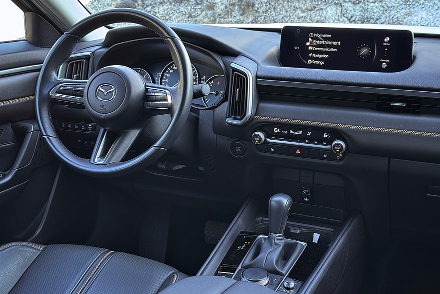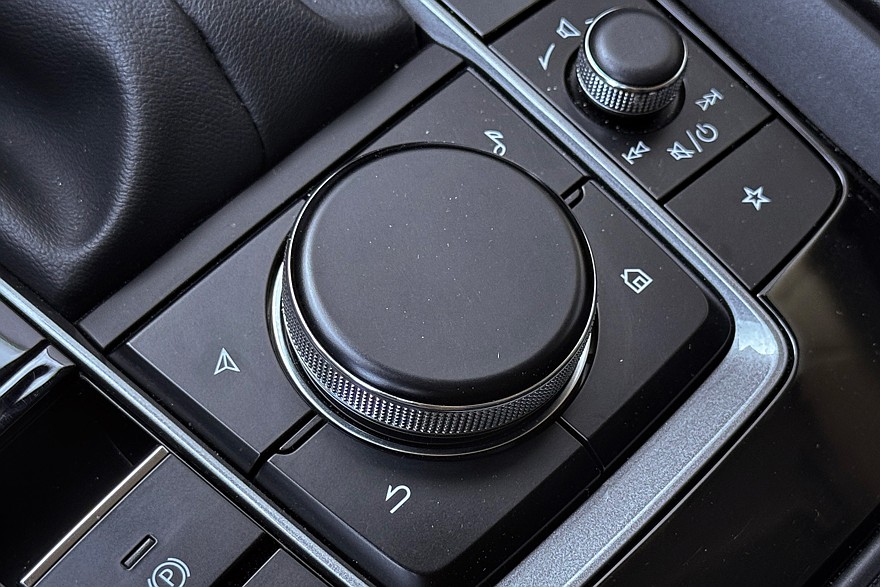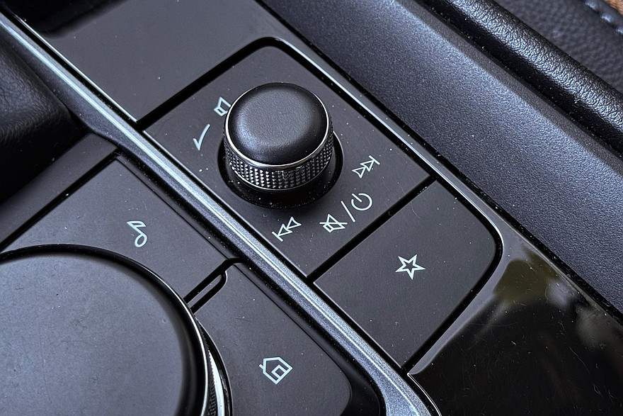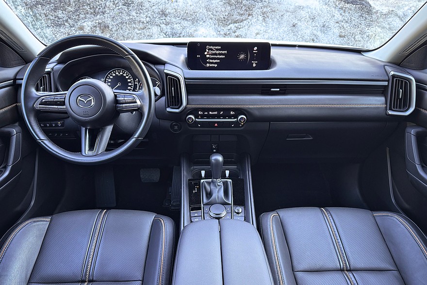Интерьер CX-50, как бы банально это ни звучало, типично японский – то есть аналоговый чуть менее, чем полностью. Но есть нюансы. Например, крошечный по современным меркам центральный дисплей – всего 10,25 дюйма по диагонали и сильно вытянутый по горизонтали, словно панель приборов. Однако дело вовсе не в размере – тачскрин работает только на скорости до 8 км/ч, а потом придётся управляться с шайбой на центральном тоннеле.