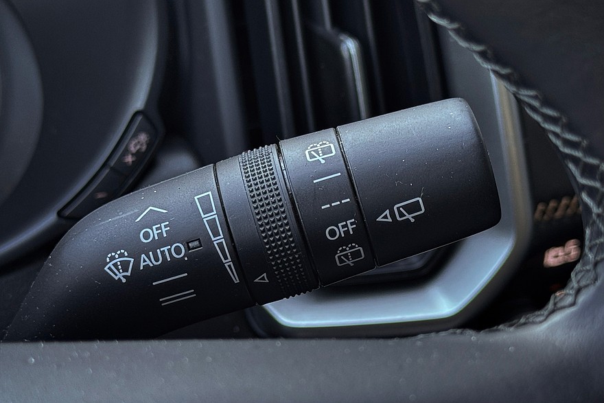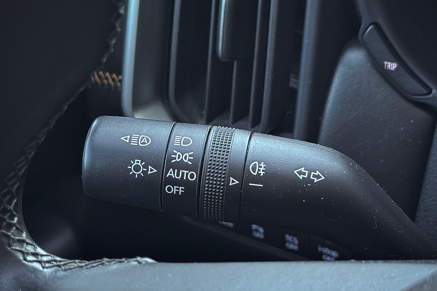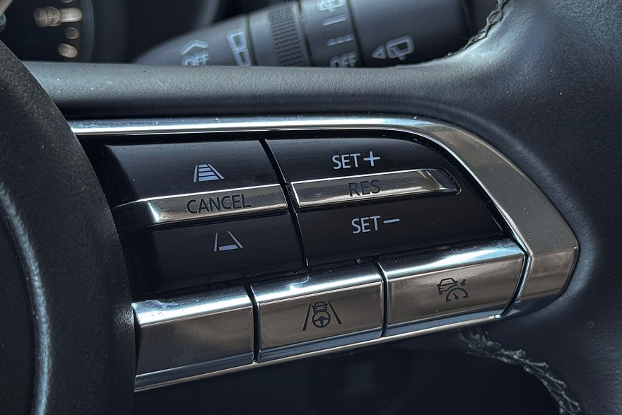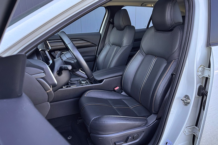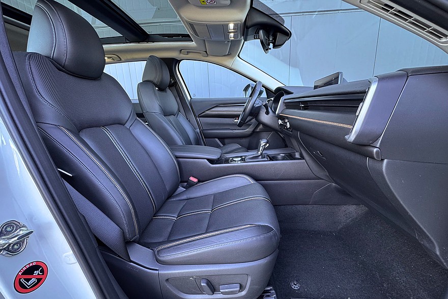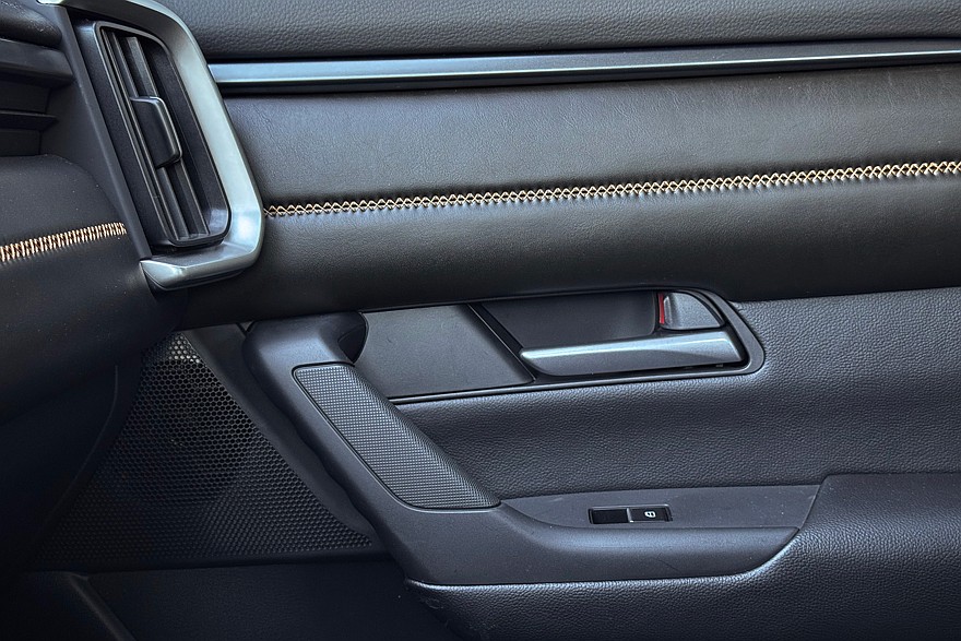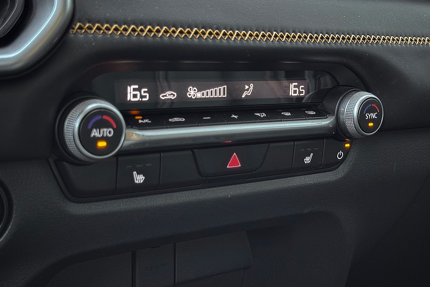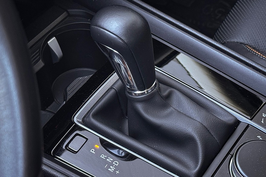 Интерьер CX-50, как бы банально это ни звучало, типично японский – то есть аналоговый чуть менее, чем полностью. Но есть нюансы. Например, крошечный по современным меркам центральный дисплей – всего 10,25 дюйма по диагонали и сильно вытянутый по горизонтали, словно панель приборов. Однако дело вовсе не в размере – тачскрин работает только на скорости до 8 км/ч, а потом придётся управляться с шайбой на центральном тоннеле.
