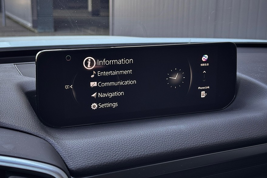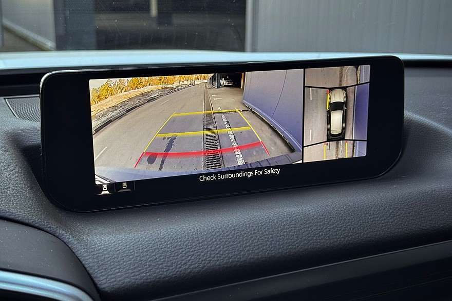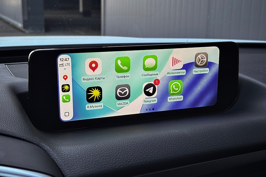 Экран выглядит устаревшим, а интерфейс мультимедийки не отличается выразительностью – сказывается возраст автомобиля. Кроме бесхитростного дизайна, здесь ещё и нет русского языка – только английский и китайский. Но чего у Мазды не отнять, так это максимально логичной структуры меню – без выкрутасов. Есть беспроводные Apple CarPlay и Android Auto, а на изображение с камер системы кругового обзора смотреть грустно. Площадка для беспроводной зарядки смартфона почему-то находится в торце подлокотника – на экран в этом случае не посмотришь.