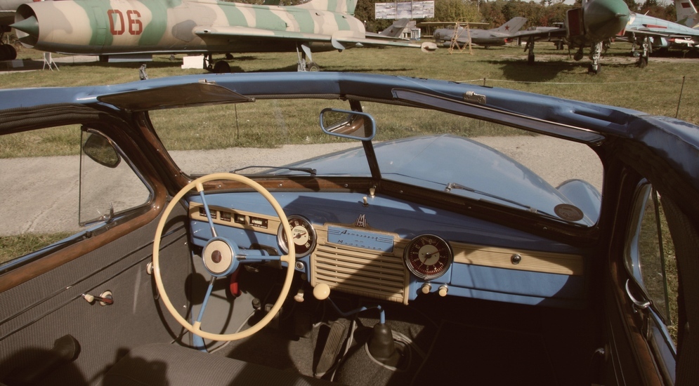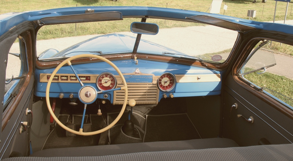 Спереди, да и в профиль кабриолет легко перепутать с седаном: и массивная рама лобового стекла, и стальные боковины кузова на месте. Владелец с иронической улыбкой опытного реставратора сообщает, что машина луженная, — проверяет меня. Но я знаю, что лужение кузова в советском автопроме никогда не использовалось как антикоррозионное покрытие. Однако наплавленным оловом на заводском конвейере заменяли непридуманные тогда еще быстросохнущие шпатлевки, и на данном экземпляре несколько кило олова наверняка есть.