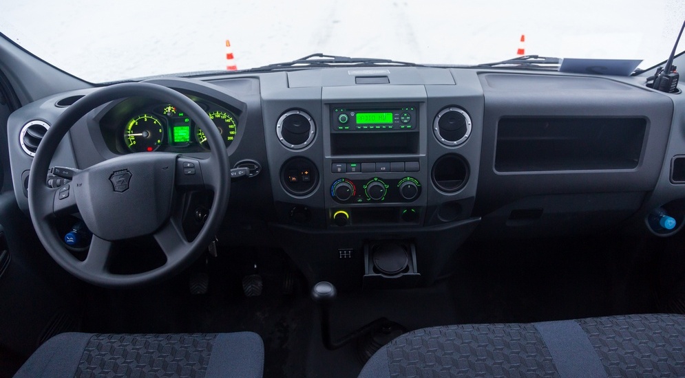 Кабина большая, трехместная. И тут действительно можно сидеть втроем. Интерьер всем хорошо знаком по ГАЗели NEXT. Отличия небольшие, но существенные — например, подрессоренное сиденье водителя с шестью регулировками и развитым поясничным подпором, плюс более массивный рычаг коробки передач. Появилась и такая полезная опция, как подогрев сидений.