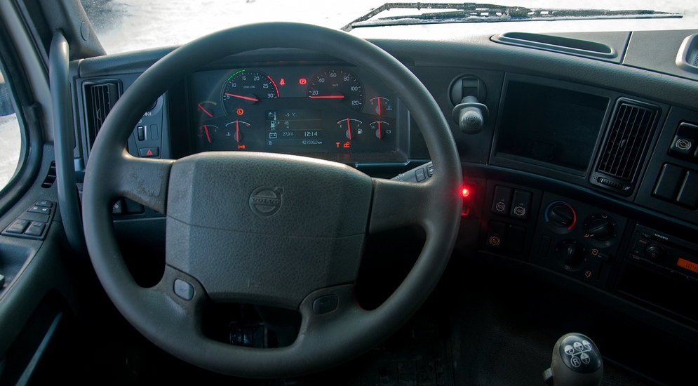 Интерьер FH12 на удивление скромный. Даже скучный. Но практичный! Панель и рулевое управление построены таким образом, чтобы максимально эффективно играть роль энергоёмкого демпфера в случае ДТП. Будем надеяться, что проверять это утверждение не придётся, но к сведению эту информацию примем. И начнём рассматривать эту панель и органы управления.