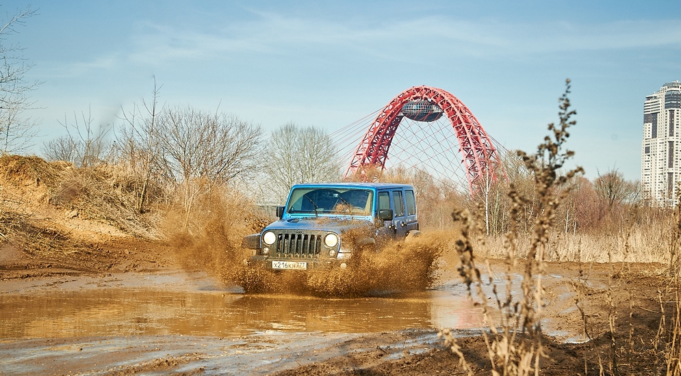 Но вот мы приехали. Площадка для мотокросса, да еще и после дождика – идеальный вариант. Тут и лужи, форсирование которых так хотел запечатлеть наш фотограф, и глубокие (по полметра) колеи, и коварные горки со сложным рельефом… И… даже обидно, но Jeep проехал везде, аки посуху. Вспоминаем матчасть: передний мост с тягой Панара, передний стабилизатор можно отключить и освободить весь ход подвески, что очень ценно на пересеченной местности. Сзади – тот же усиленный мост с пятиточечной системой крепления, рычаги расположены за пределами рамы, а пружины – внутри рамы, что позволило разместить топливный бак в центральной области, а это хорошо и для развесовки, и для управляемости. Дорожный просвет вроде бы невелик – 210 мм. Но все узлы под днищем скомпонованы так, что повредить их очень трудно, так что можно смело грести "пузом" в колее – пока колеса не потеряют сцепление, Wrangler будет ехать. И вот ведь незадача: ни понижайку, ни блокировку заднего дифференциала включать не пришлось – Wrangler едет и все. Горка – легко. Колея – не вопрос. Лужа? Побольше хода, брызги под три метра, но опять никакого напряжения. Через час фотосессии на площадке не осталось ни единого места, где я бы не проехал, и везде автомобиль ехал с колоссальным запасом, а на одежде фотографа не осталось ни одного чистого кусочка. Единственное, что я сделал, съехав с асфальта, – включил полный привод, ибо он здесь подключается жестко, лишен межосевого дифференциала, и использовать его можно только на скользком покрытии. Все остальное время Jeep – заднеприводный.