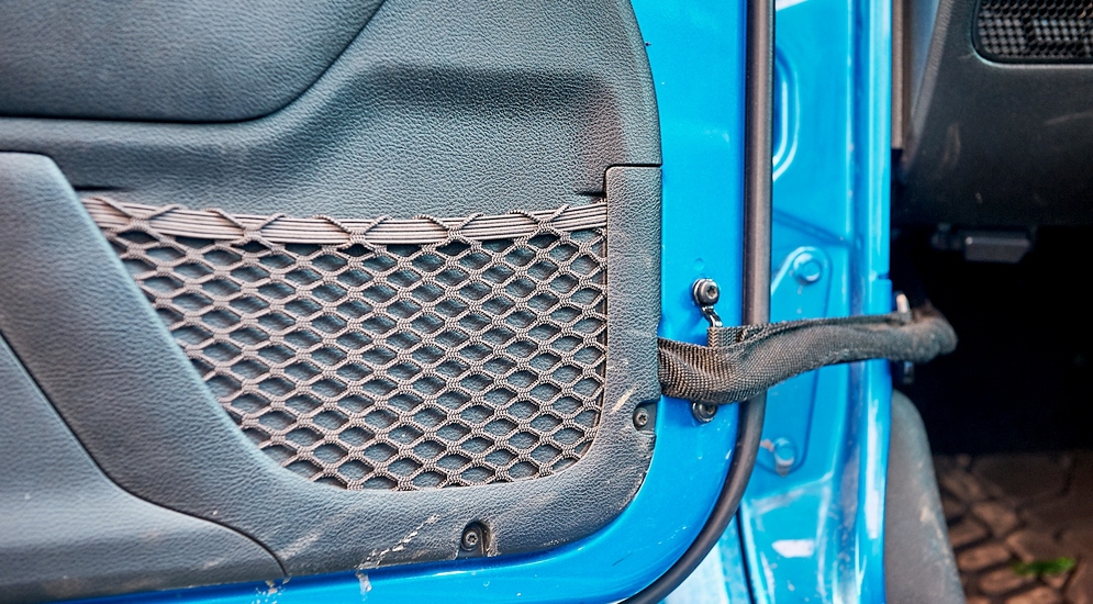 Однако эмоций много, но факты я сообщить обязан. Салон Wrangler Unlimited специфичен в той же мере, как и его внешность. Двери в открытом состоянии фиксируются тросами, то есть на тесной парковке дверную рукоятку надо держать крепко, дабы не покалечить автомобиль соседа. Чтобы закрыть любую из дверей, надо как следует хлопнуть. Плюхаюсь на водительское место – голова упирается в ручку, закрепленную ремешками на трубчатом каркасе безопасности, который обит вспененным материалом и обшит грубой тканью.На крыше – огромные фиксаторы и дешевая отделка из полиуретана. Передняя панель плоская, из грубого черного пластика. Но есть мультимедиа с навигацией, кондиционер, электростеклоподъемники (четыре кнопки прямо по центру консоли) и подстаканники. Сурово, но жить можно. Правда, длинноногим придется несладко: центральная консоль широкая, и в том месте, где в нее упирается колено, еще отформован ощутимый прилив – на моей правой ноге неделю после теста красовался огромный синяк.