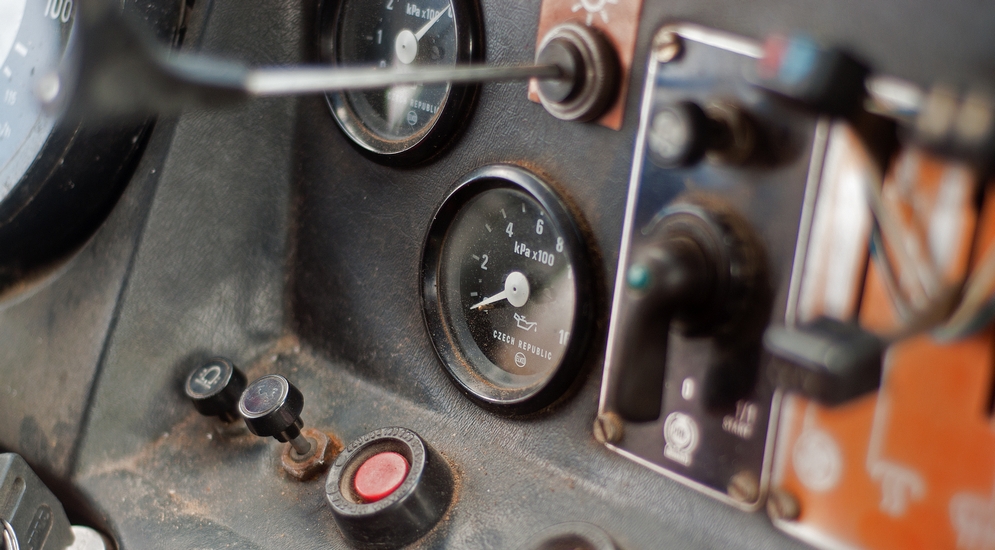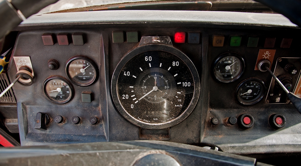 «Приборки» советских грузовиков делали просто: железная панель, в которой вырезаны отверстия для подходящих существующих приборов. Дизайна там обычно было меньше, чем в телевизоре «Радуга». Скорее всего, именно поэтому чешский самосвал внутри выглядит пришельцем из будущего. Панель имеет вертикальную и горизонтальную плоскости, но и это не самое главное. Её «фишка» в том, что она мягкая! Да-да, её можно трогать руками и получать от этого некоторое удовольствие. Но давайте рассмотрим приборы и органы управления, тут тоже есть, чему порадоваться.
