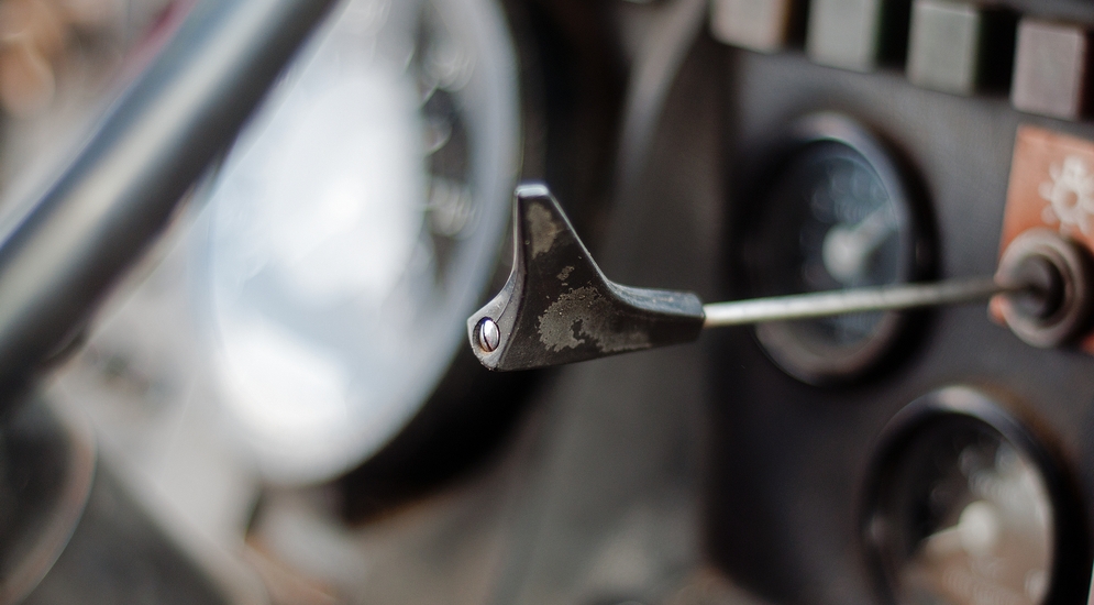 Нам осталось выяснить назначение двух переключателей, торчащих на длинных металлических стержнях из панели справа и слева от руля. Итак, левый – это центральный переключатель света. Допустим, ему можно выглядеть так, как захочется. Но вот переключатель справа – это указатель поворотов, тот самый рычажок, который обычно расположен в подрулевом переключателе. Пользоваться им неудобно, приходится снимать руку с руля, что при повороте не сильно напрягает, но на ходу, во время перестроения, становится очень неудобной особенностью. Канистра в ногах у пассажира – это не канистра вовсе, а бачок стеклоомывателя. В кабине он не замёрзнет, поэтому его штатное место именно здесь.