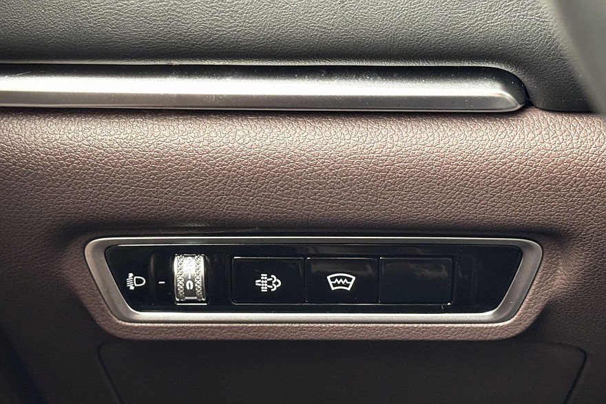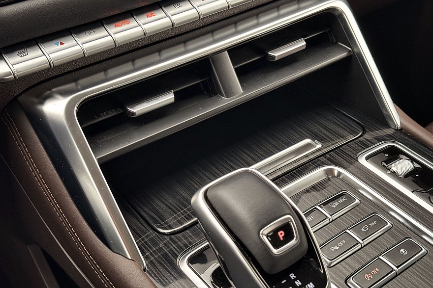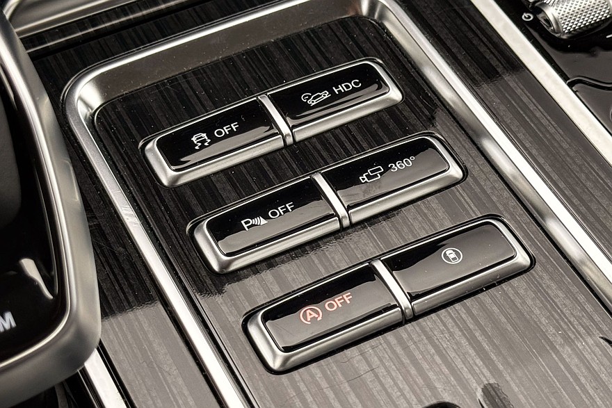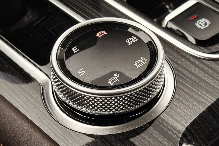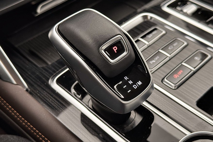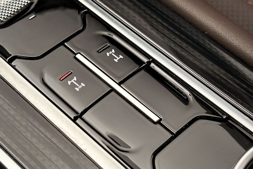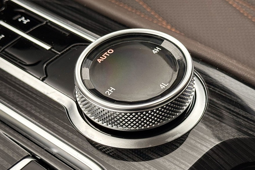 Трансмиссия управляется парой массивных шайб на центральном тоннеле. Правая заведует режимами работы полного привода – можно выбирать между Auto, 2H, 4H и 4L, то есть либо оставить задний привод, либо принудительно включить полный – в том числе с понижающей передачей, либо оставить всё это на откуп электронике, которая сама решит, когда подключать переднюю ось. В автоматическом режиме можно переключать режимы движения.