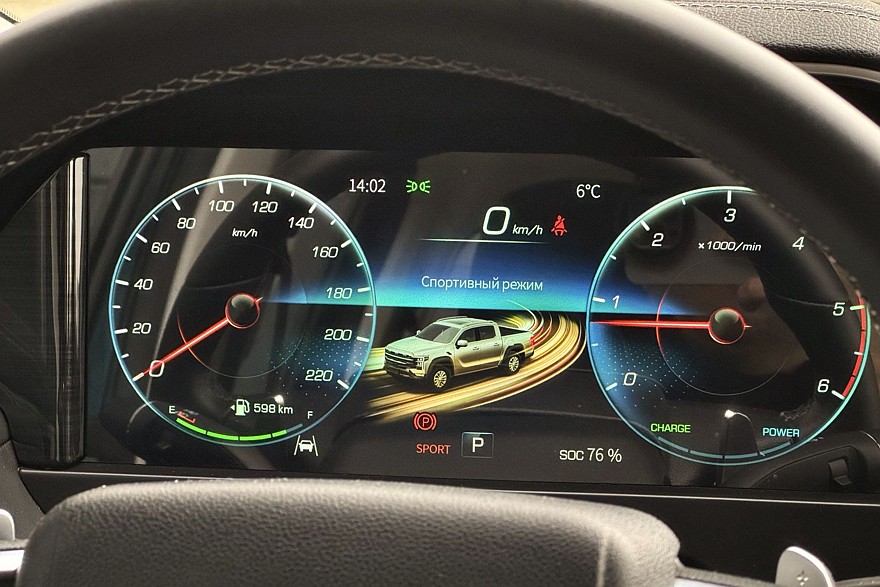 В нижней части тахометра есть индикатор работы стартер-генератора, и если ему верить, электромотор работает не только при старте с места, но и при обгонах даже на трёхзначных скоростях. В первом случае его помощь действительно ощущается: тяжёлый пикап трогается и разгоняется живее, чем ожидаешь от 159-сильного двигателя под капотом. Небольшая литий-ионная батарея за спинкой заднего дивана довольно быстро разряжается, но при активных торможениях спешно навёрстывает заряд.