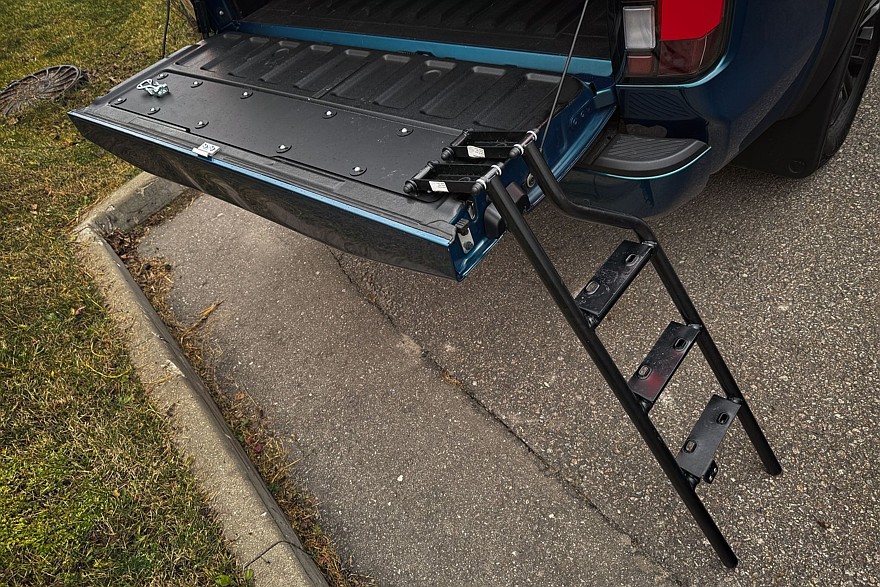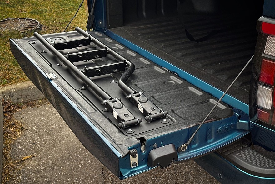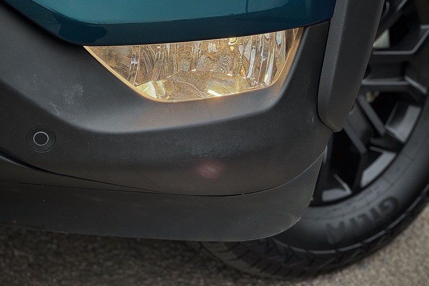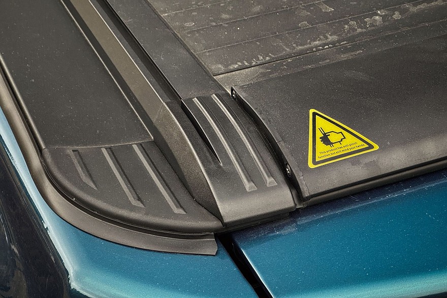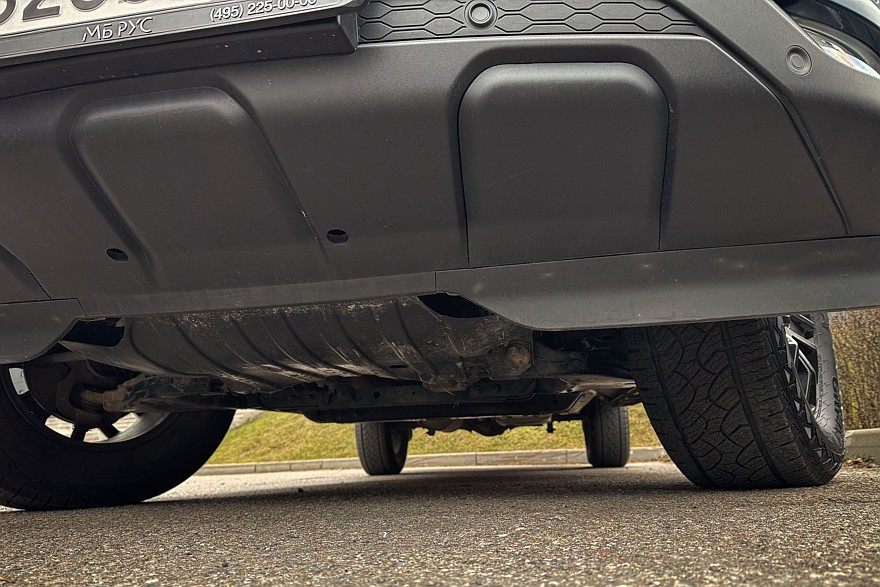 Кузов закрывает опциональная рулонная штора, которая запирается на ключ – удобная штука. И практичная: даже после сильного дождя в грузовом отсеке не было ни капли. В откидной борт встроена лестница, по которой можно подняться в кузов без акробатических этюдов – ещё один полезный аксессуар. Если бы её не было, пришлось бы забираться в грузовой отсек, наступая на высокий бампер. Есть штатный фаркоп, а под кузовом в заднем свесе спрятано запасное колесо.