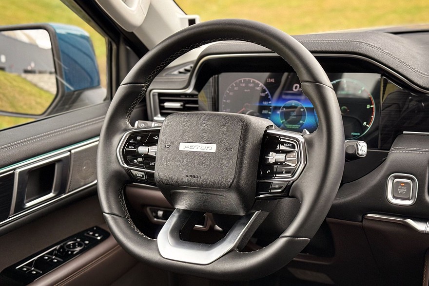 А вот интерьер Фотона – легковой. Ничто здесь не напоминает о том, что это пикап, пока не посмотришь в зеркало. Коричнево-чёрная отделка в тестовой машине более практична, чем две других схемы – сине-белая и оранжево-коричневая. На фотографиях салон выглядит дорого и солидно, но на ощупь впечатление иное – материалы недорогие и в меру грубоватые. Нижняя часть дверей, центрального тоннеля и передней панели отделаны жёстким пластиком.