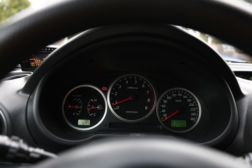 Подхват турбины начинается с 3,5-4 тысяч, основная полка момента располагается в диапазоне от 4-4,5 до 6-6,5 тысяч оборотов. Отсечка – на 7000 оборотов. Передачи «длинные»: на первой машина легко разгоняется до 60 км/ч, на второй – до 100-110. Чтобы добраться до трека, не расходуя топливо избыточно, можно спокойно ехать по магистрали на шестой передаче: при скорости около 130 км/ч двигатель умиротворенно и относительно экономно урчит на 2,5 тысячах, и тяги ему хватает. Да, многие современные авто запросто уделывают WRX на прямой, но его динамики все же хватает, чтобы при резком старте телефон, лежащий на торпедо, оказался на заднем сиденье. Ну а на извилистой дороге мало кто из нынешних машин с мощностью за 400 л.с. потягается на равных с этим старичком и сегодня!