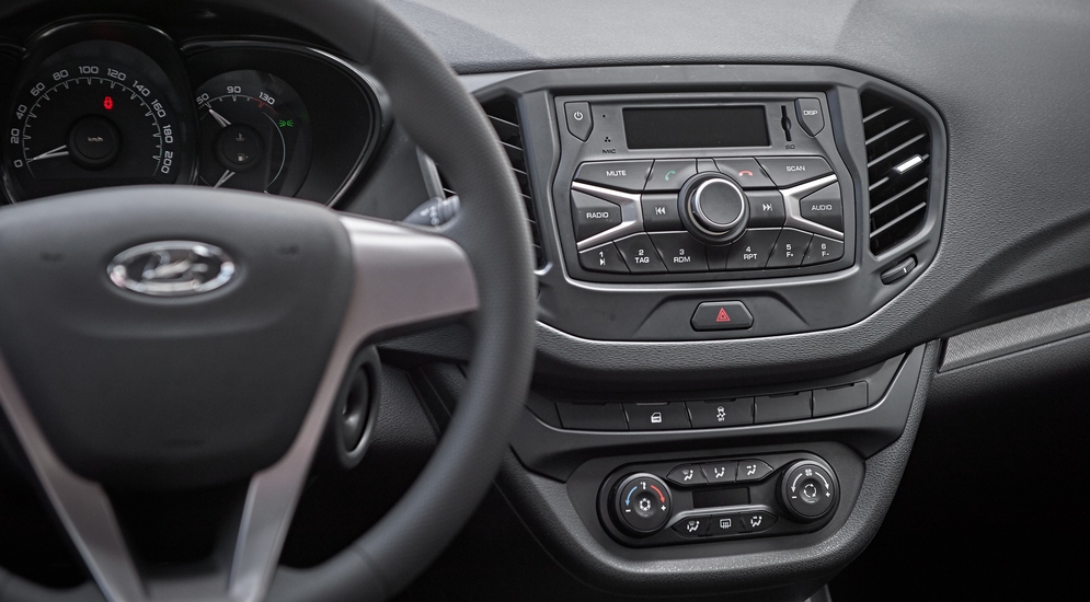 Признаю, что дизайн передней панели Весты оригинальным не назовешь. Как в лучших домах Европы и Филадельфии. Главный элемент – двухдиновая магнитола с огромными кнопками. Хорошо, что дисплей у нее сделали инверсивным (белые буквы на черном фоне), – ночью он не будет маячить в периферическом зрении.