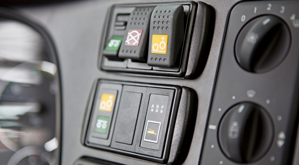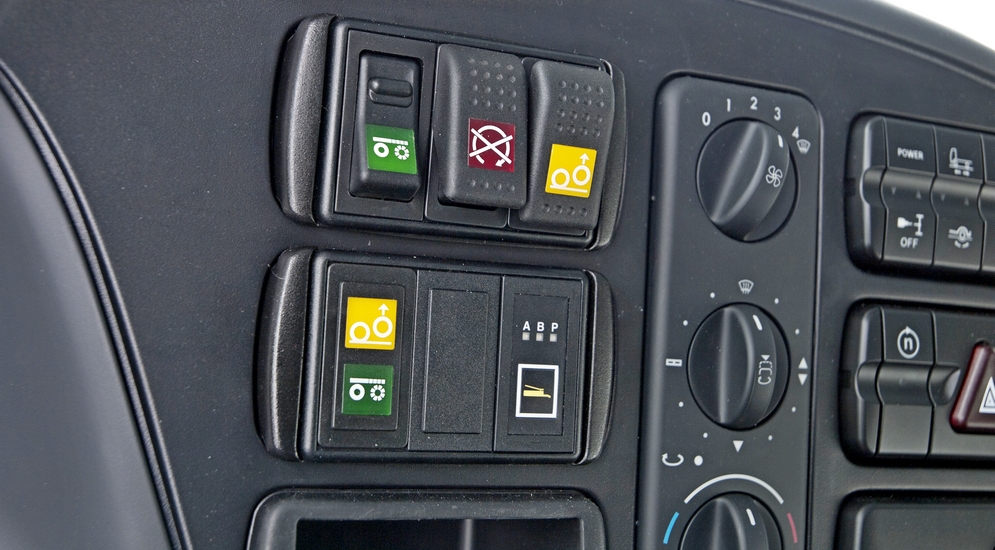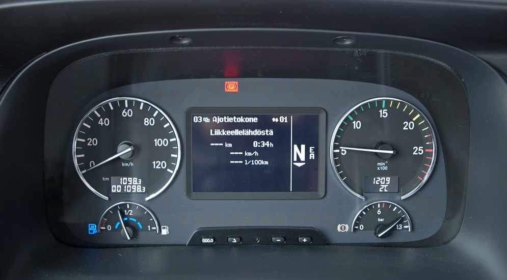 Забираемся в кабину и... ничего экзотического в ней не находим. Привычный интерьер Mercedes MP3 разбавлен наклейкой «Sisu» на руле, да на панели еще несколько кнопок, отвечающих за дополнительный автономный обогреватель Webasto и коробку отбора мощности – она приводит в движение гидронасос, подающий давление на манипулятор.