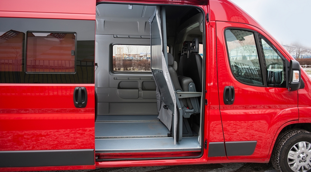 Не секрет, что такие машины зачастую покупают как заготовки для маршруток, но и при использовании по прямому назначению трудностей с погрузкой не будет: задние распашные двери можно раскрыть, на 90°-180°, а опционально – на 270°. Боковая сдвижная дверь по правому борту – во всю высоту фургона, шириной 1 250 мм. Остаётся добавить, что стандартный цельнометаллический фургон вмещает до 15 кубометров груза, и при односкатной ошиновке его максимальная грузоподъемность составляет до 1,9 т – рекордный показатель в классе! Но у нас фургон совсем не стандартный: грузопассажирская версия с салоном «Ривьера» Universal Transformer.