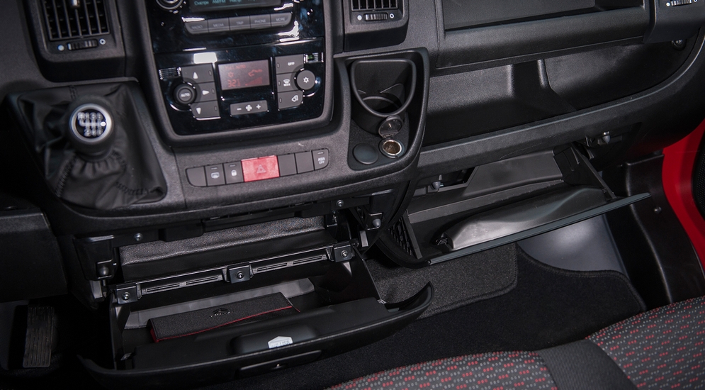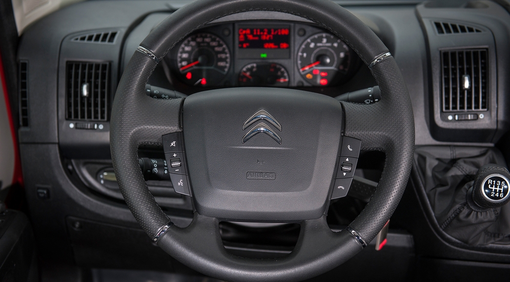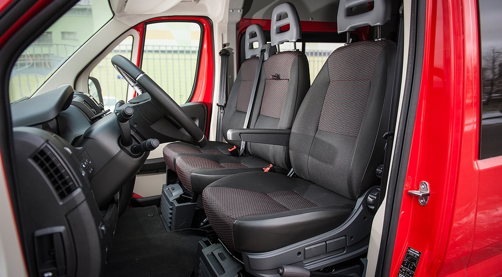 Открываем водительскую дверь – и взгляд упирается в рукоятку ручного тормоза, встречающую в проеме. Подняв глаза, по двум ступеням поднимаемся в салон. Здесь отличий от парочки Peugeot–Citroen еще меньше – только фирменные эмблемы, ну и подогреватель охлаждающей жидкости Webasto – это нелишняя деталь в условиях российской зимы. Устроиться за рулем сможет водитель любой комплекции, диапазоны регулировок вполне достаточные. Профиль водительского сиденья можно назвать оптимальным. Из опций – откидывающийся подлокотник, регулировка поясничного подпора и подогрев. Кстати, кнопка подогрева находится со стороны водительской двери в 10 см от пола, причем так, что если не читать инструкцию, то можно проездить всю зиму, не узнав о ней.