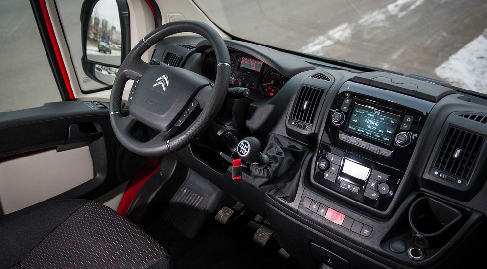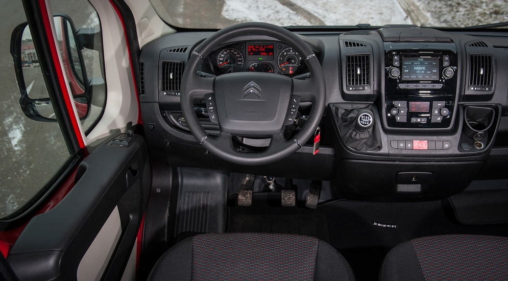 Передний привод и эластичный двигатель трудно переоценить на гололеде – пустой фургон спокойно трогается со второй передачи и плавно разгоняется. Несмотря на нескромные габариты, Citroёn Jumper вполне уверенно чувствует себя на переполненных московских парковках – главное, чтобы хватило места для поворота. Для облегчения водительского труда есть камера заднего вида, но она лишена разметки и требует привыкания – думается, что большинство водителей предпочтет парковаться по зеркалам, благо они огромные, а нижняя «кривая» секция позволяет рассмотреть, что происходит в непосредственной близости к борту. В полном соответствии с последними тенденциями Jumper обзавелся целым набором электронных помощников. Электронная система курсовой устойчивости (ESC) с функцией предотвращения опрокидывания, адаптивная система определения нагрузки и центра тяжести (LAC) и система помощи при трогании на подъеме (Hill Holder) входят в базовую комплектацию. А в длинном перечне опционного оборудования есть, например, система контроля тяги Traction+ с функцией помощи при движении под уклон (Hill Descent Control).