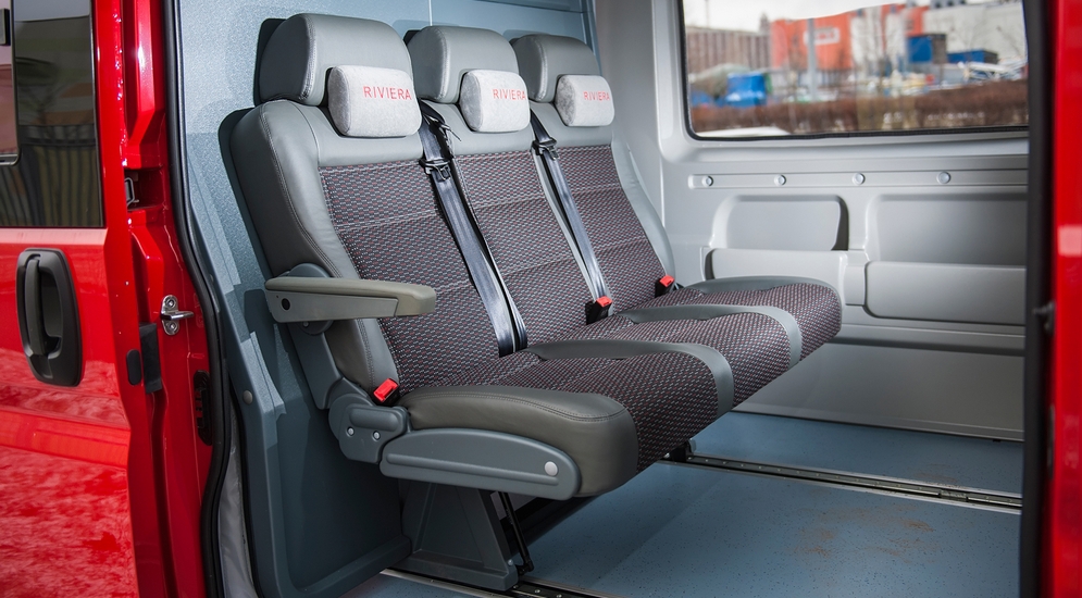 Сам диван тоже оставляет ощущение качественного изделия, складывается при помощи газовых упоров, имеет хорошие материалы, три подголовника и трехточечные ремни безопасности – все на высоте. Вот только разрабатывался этот диван для VW Transporter, и в широченном салоне Jumper смотрится откровенно маленьким, да и сидеть на крайнем сиденье в 30 сантиметрах от стенки не очень уютно. Здесь больше подошел бы четырехместный диван – кстати, его можно было бы использовать как спальное место – но такого в модельной линейке «Ривьеры» просто нет.